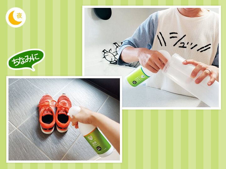 玄関は特にニオイがこもりやすいので、消臭効果もある「P’s GUARD除菌スプレー」が活躍。