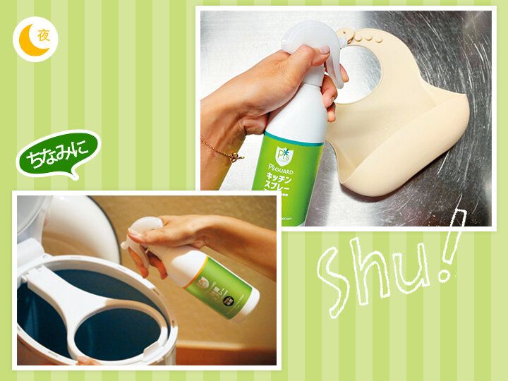 シリコン製のお食事エプロンは、使用後にサッと水洗いしてから、「P’s GUARDキッチンスプレー」で除菌。ツンとするニオイがないので使いやすい♪