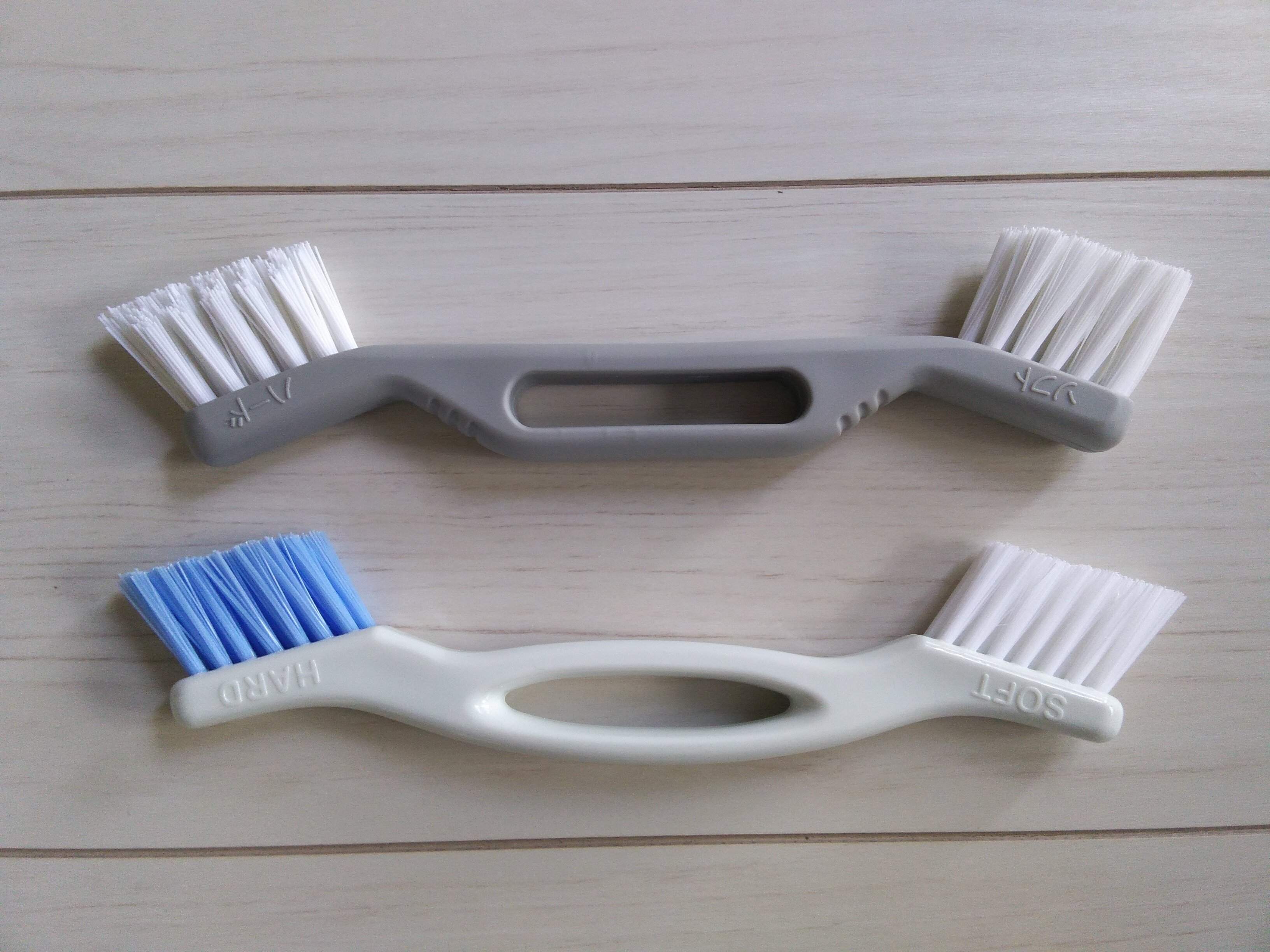 というわけで、ブラシのほうがおすすめです。歯ブラシでも代用できますが、もう少し大きいほうが効率的。柄の両側に硬さの異なるブラシが付いた「目地ブラシ」などがおすすめです。