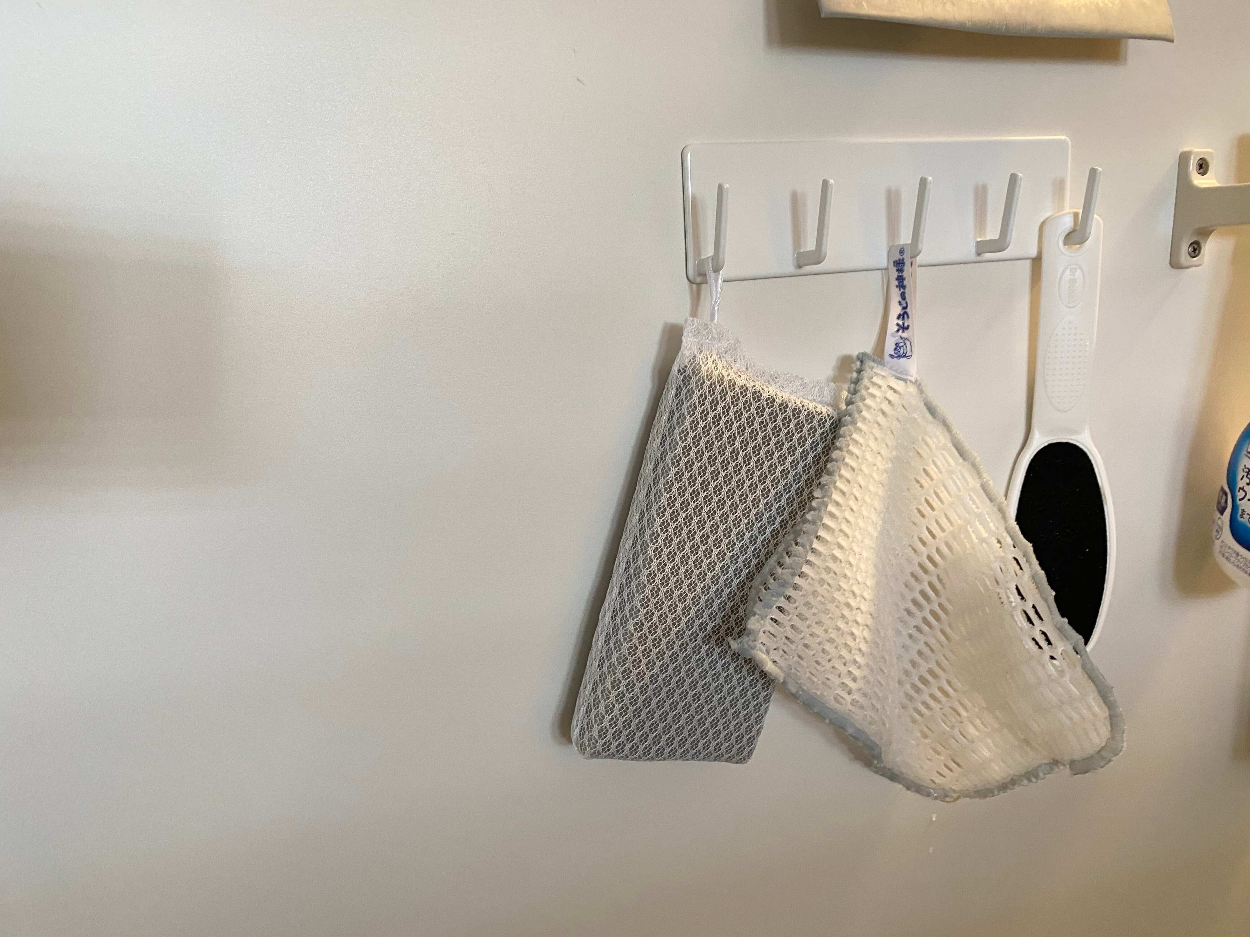 メッシュクロスは使い終わったらもみ洗いをして、タグに引っ掛けて干しておくことができます。
