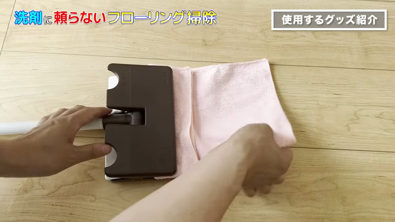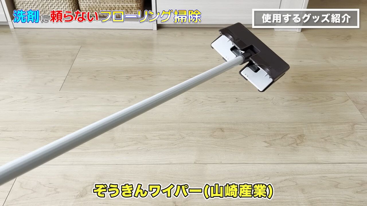 床拭き掃除に使用するアイテムは全部で3つ。まずは、山崎産業のぞうきんワイパーです。しっかり力を加えても快適に拭きあげることができ、今回の掃除に適しているそうです。