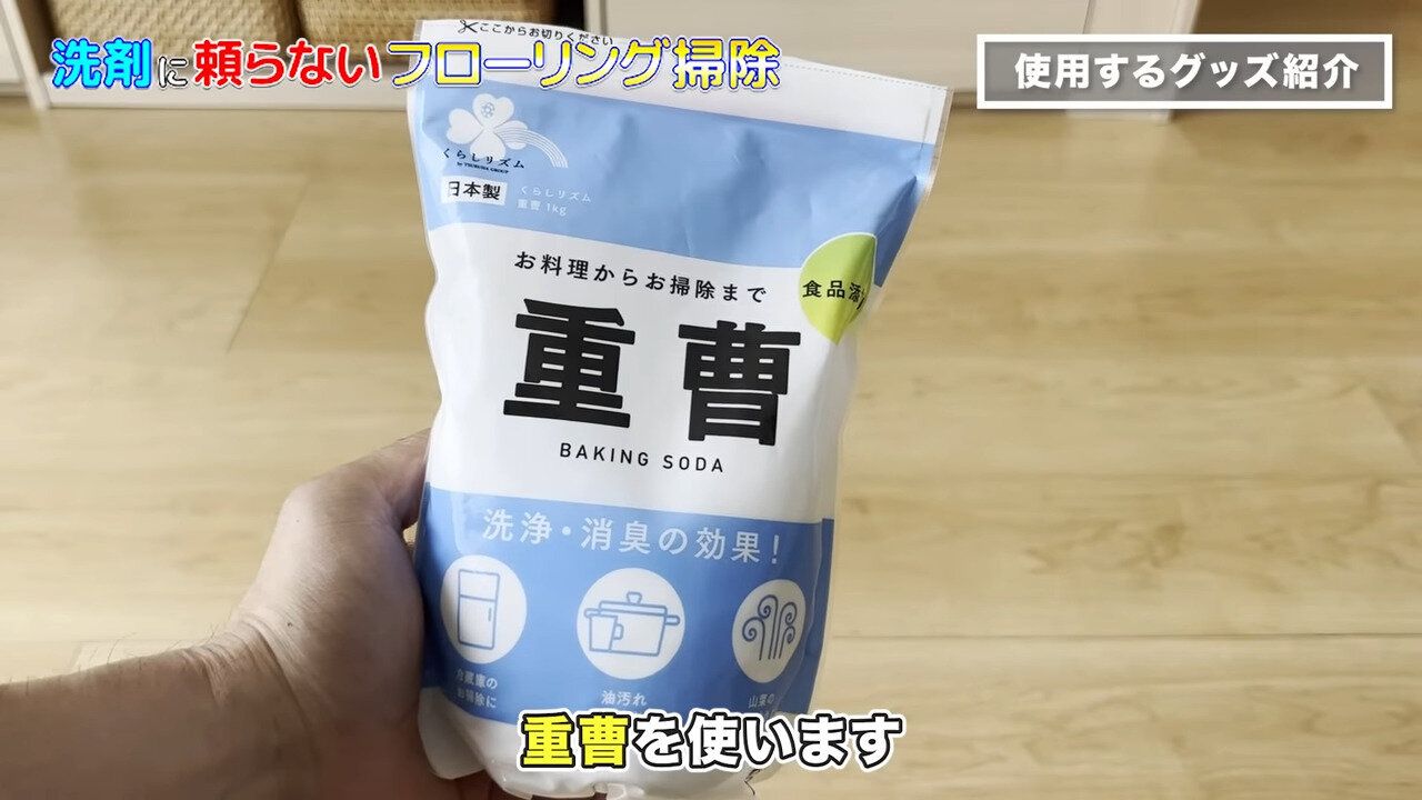 “洗剤の力に頼らない” ということですが、少しは何か加えて拭いた方が汚れ落ちがよくなるため、重曹を使います。界面活性剤が含まれていないので、拭きあげ後のヌルヌルや洗剤のこりの心配もなく、安全性も高いそうです。