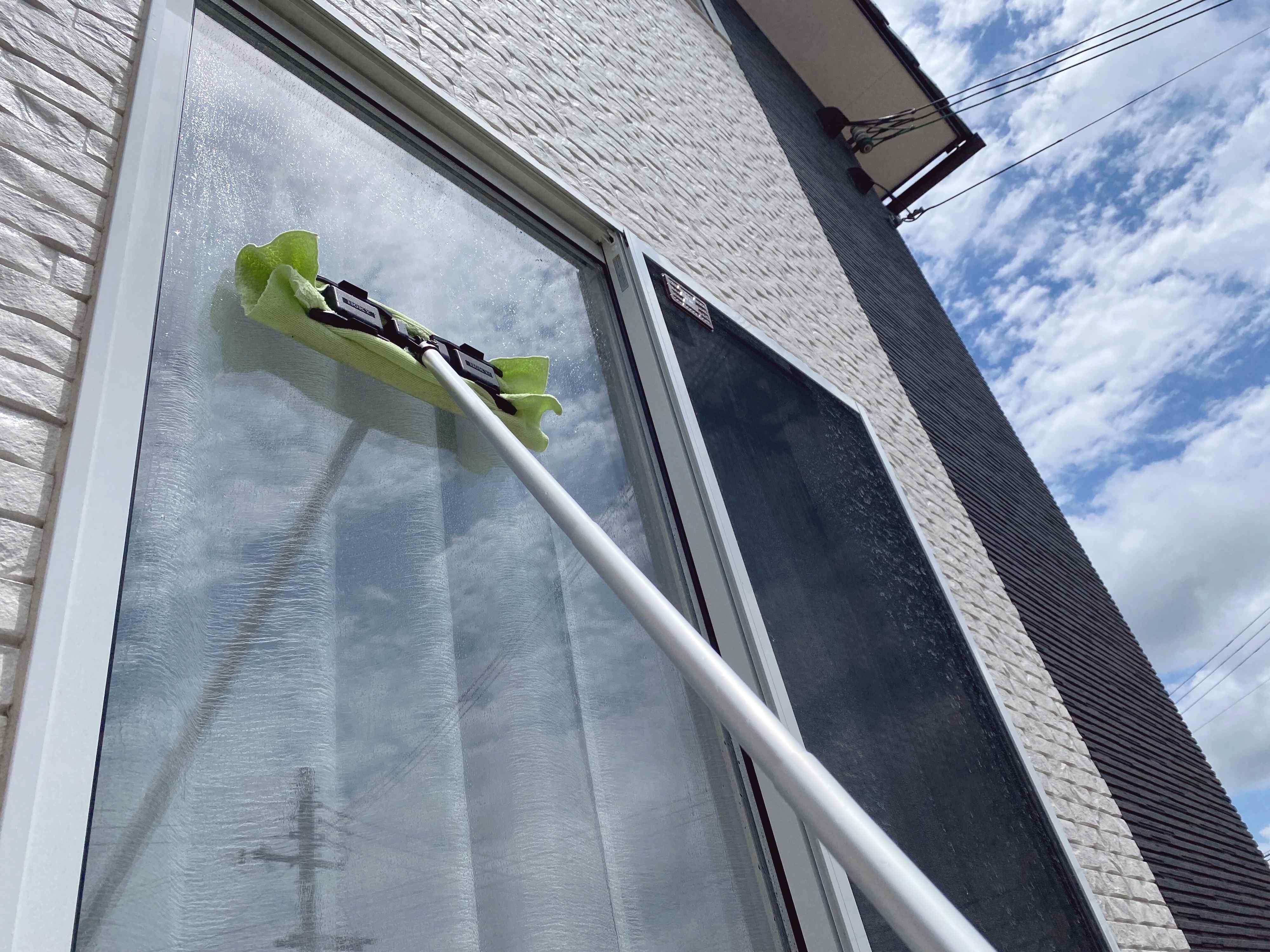 外のホースリールから窓やサッシ全体に水をかけるだけで大まかな汚れは落ちるので、そのあとクリーンモップにおそうじクロスを取り付けて拭きます。