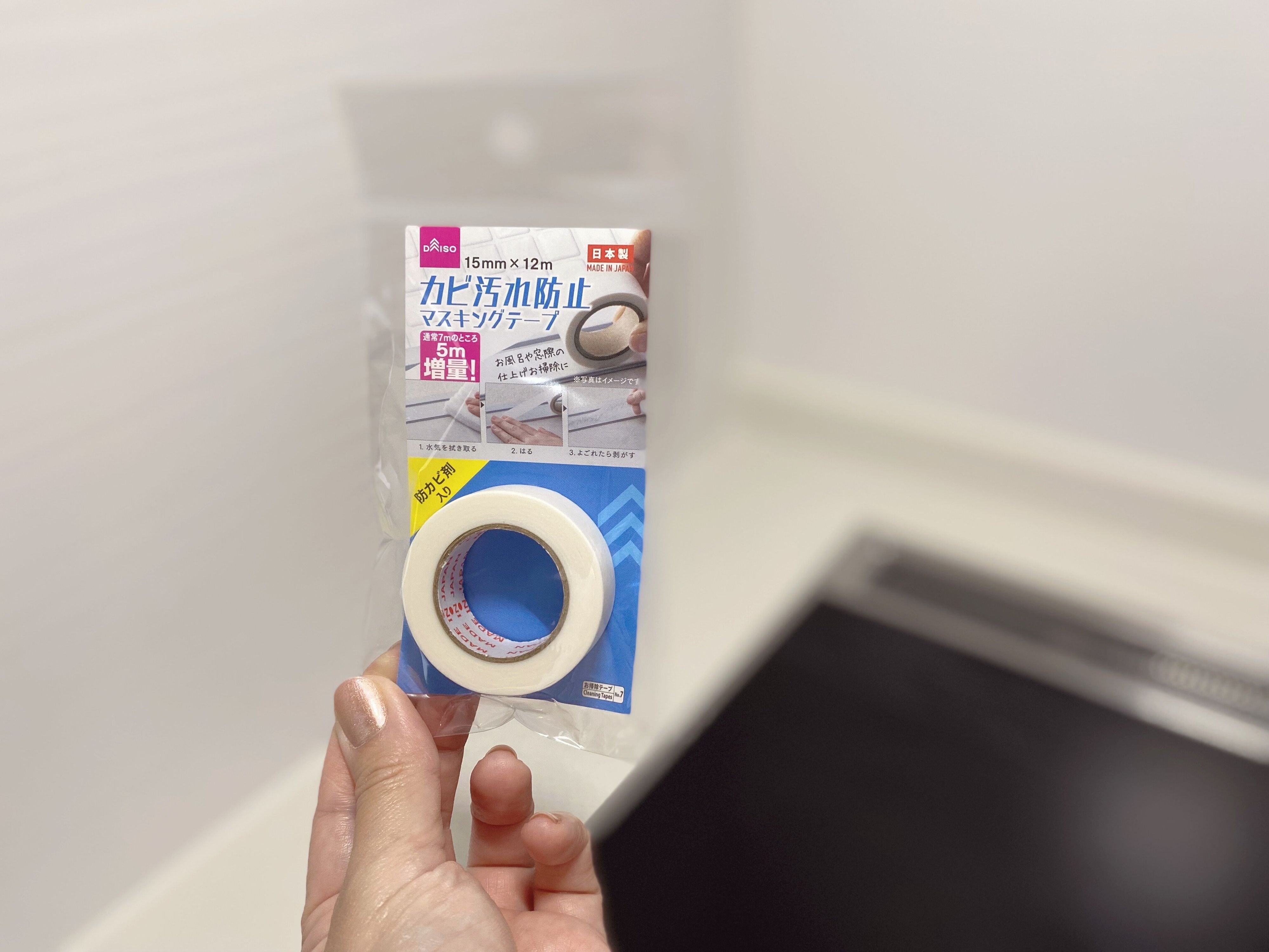 つい先日購入したダイソーのカビ汚れ防止剤マスキングテープは、幅15mm×長さ12mでした。