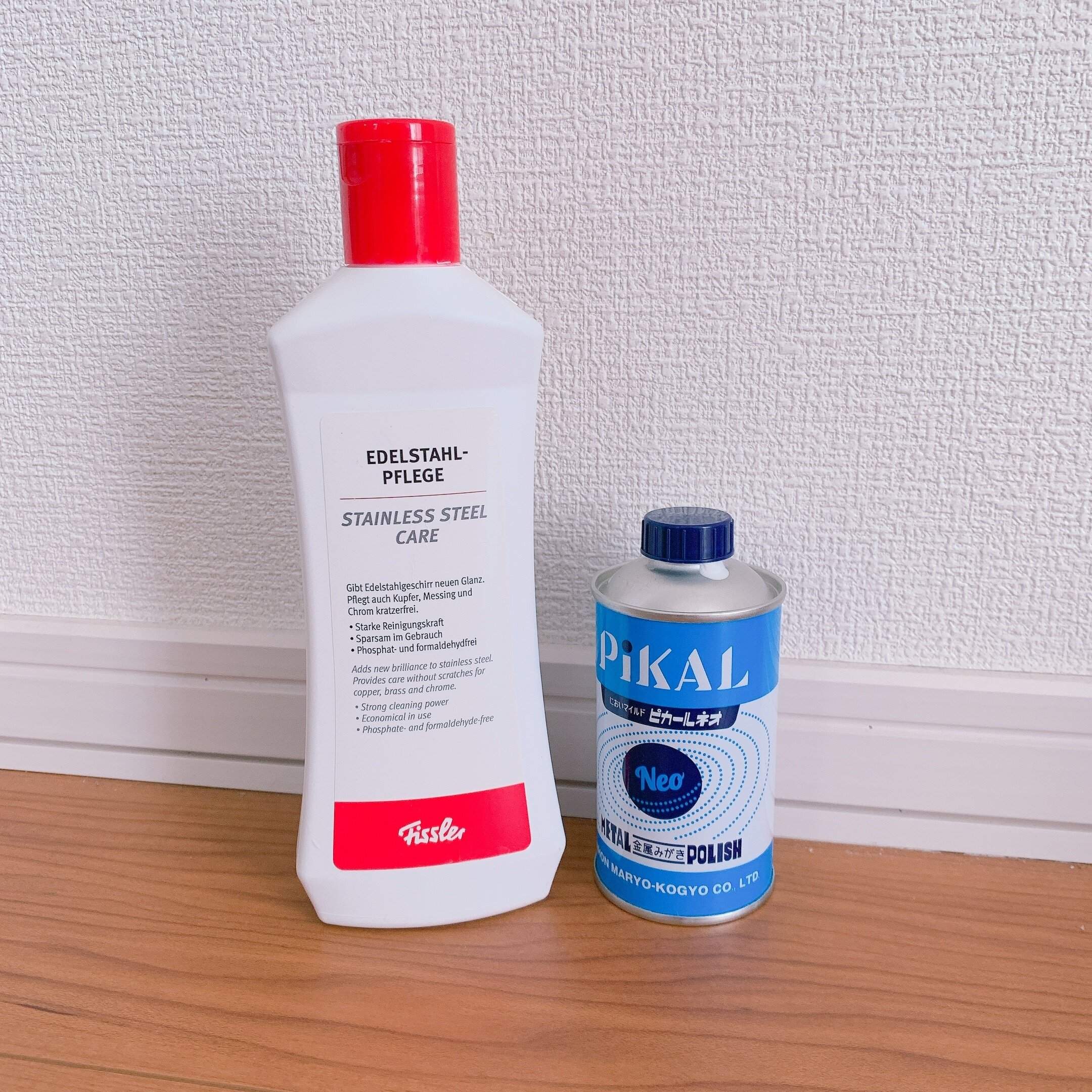 右のピカールは、研磨剤ですが見た目はクリーム状。柔らかい布でにピカールをひたすら拭いていき、別布でふきあげればOK!我が家ではピカールで拭いた後、さらに食器用洗剤やウタマロで洗っています。