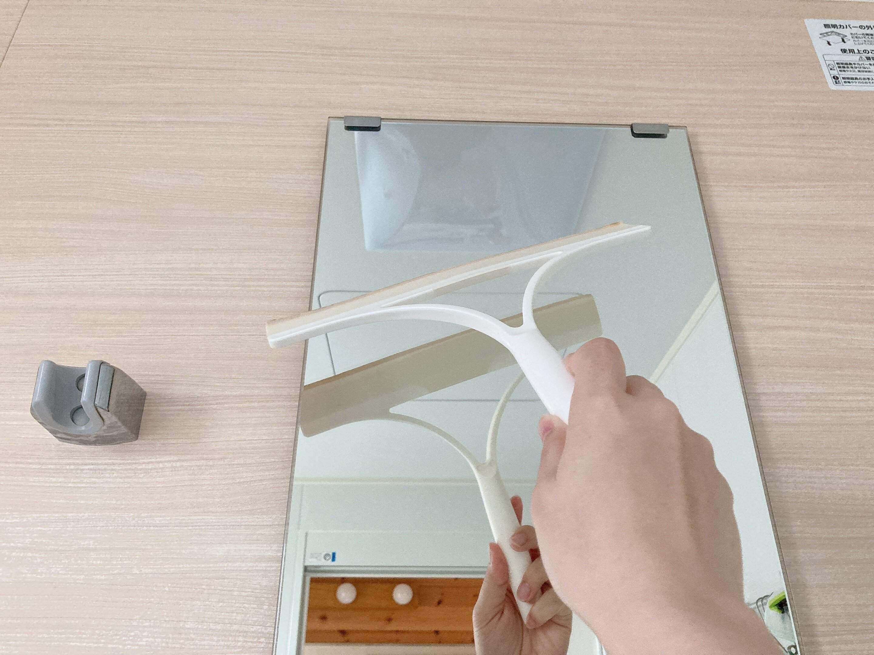 我が家では毎日水切りワイパーをすることで、3年経った今もピカピカの鏡を維持しています。最後にタオルで残った水気を拭き取れば完璧!