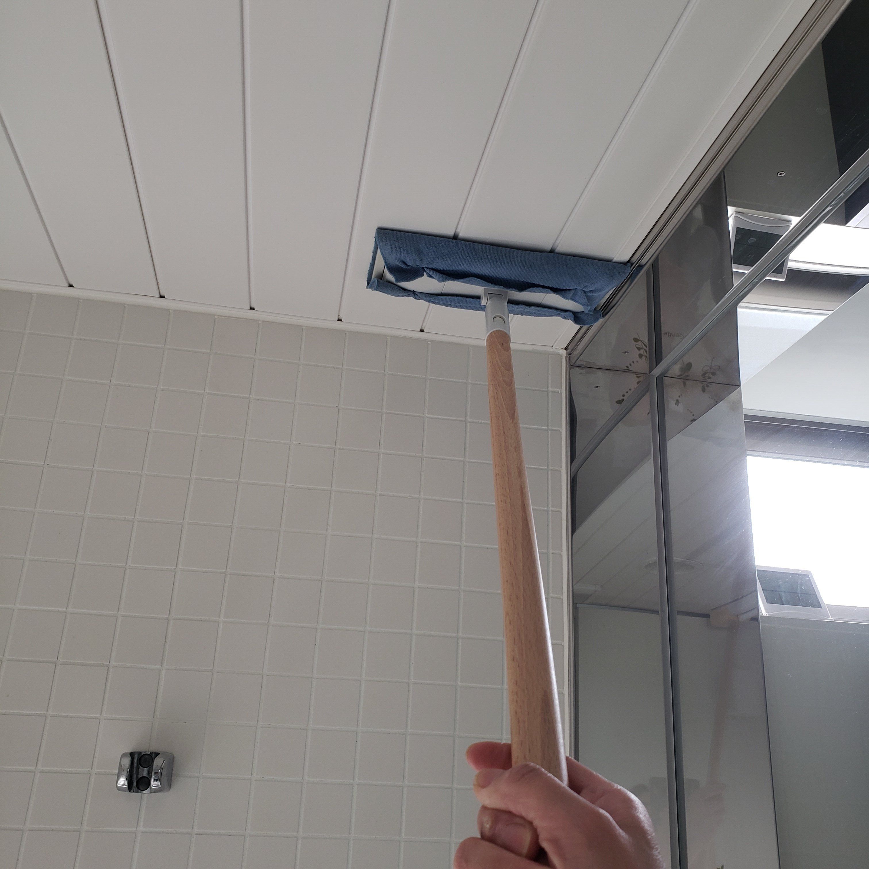 天井は届かないので、モップにクロスを取り付けて、そこにパストリーゼをたっぷり吹きかけてから拭くようにしています。