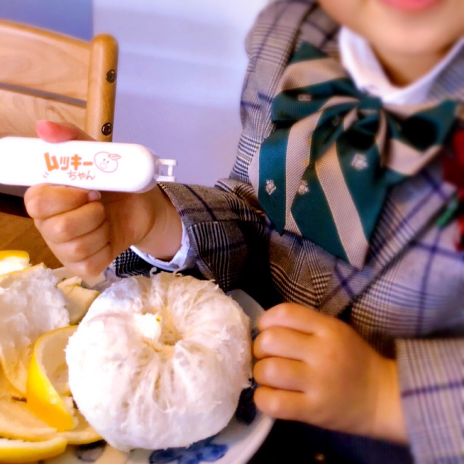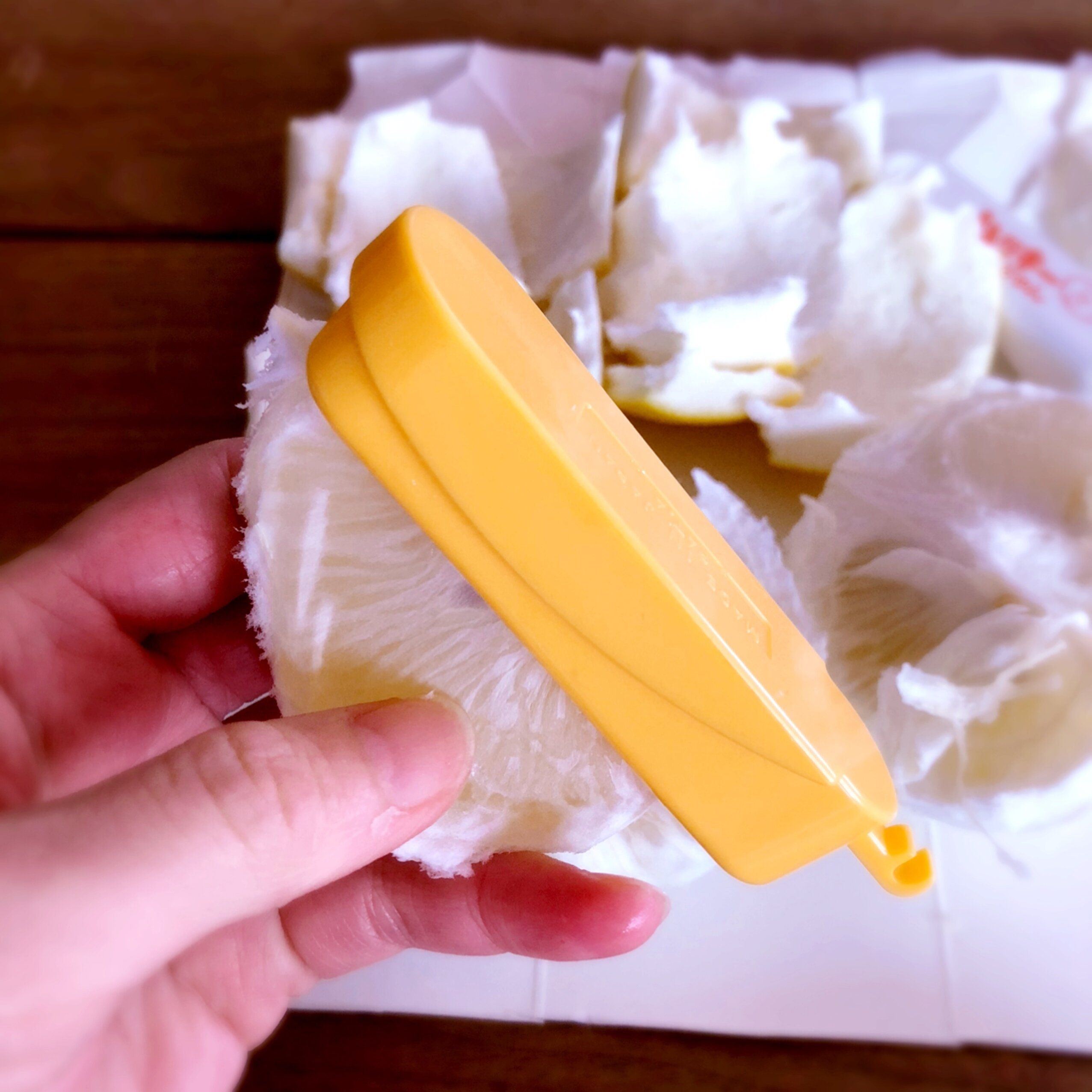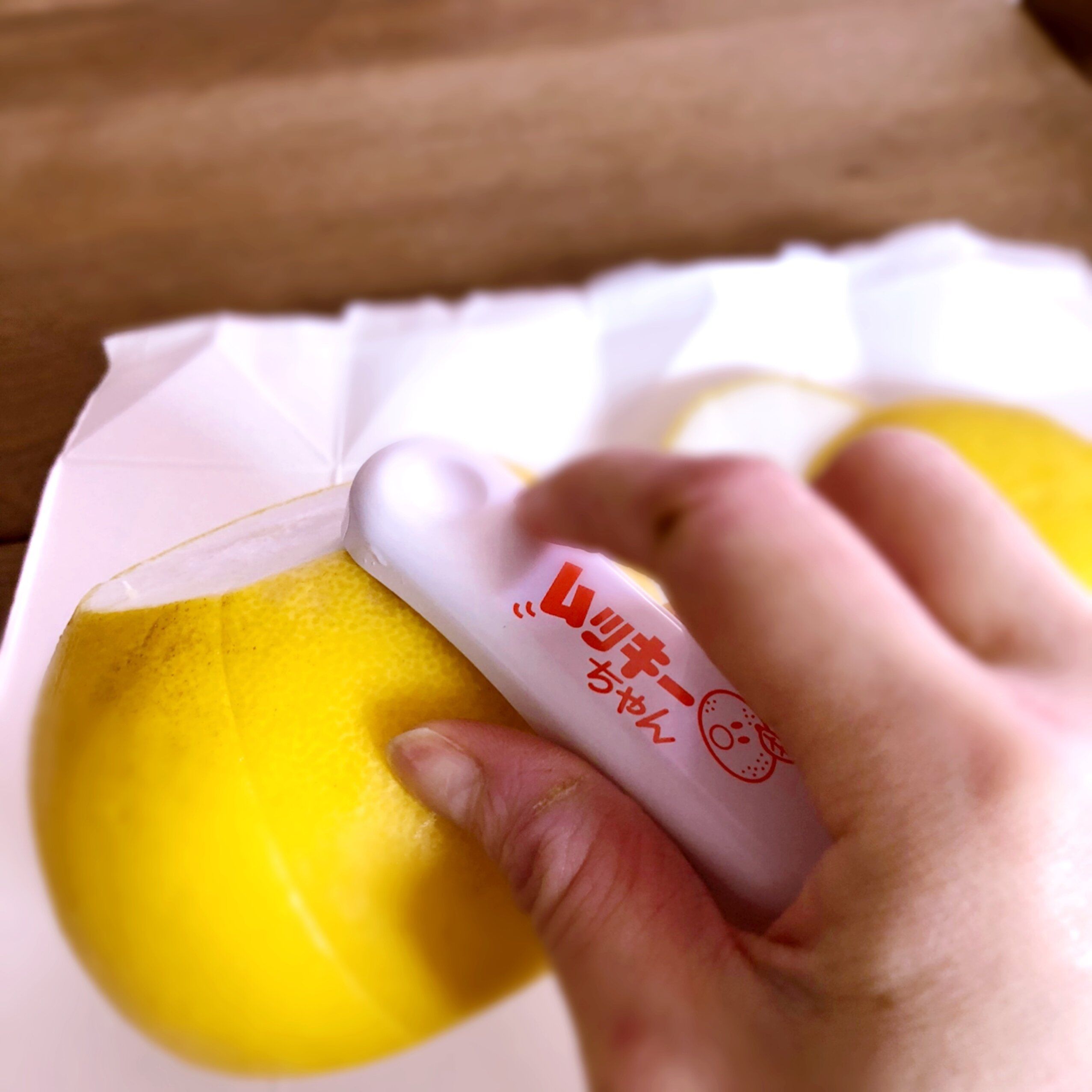 【ムッキー】のオレンジの部分を房に当ててスッと引くと簡単に切り込みが入ります。果肉の皮は面白いようにキレイに剥けます。