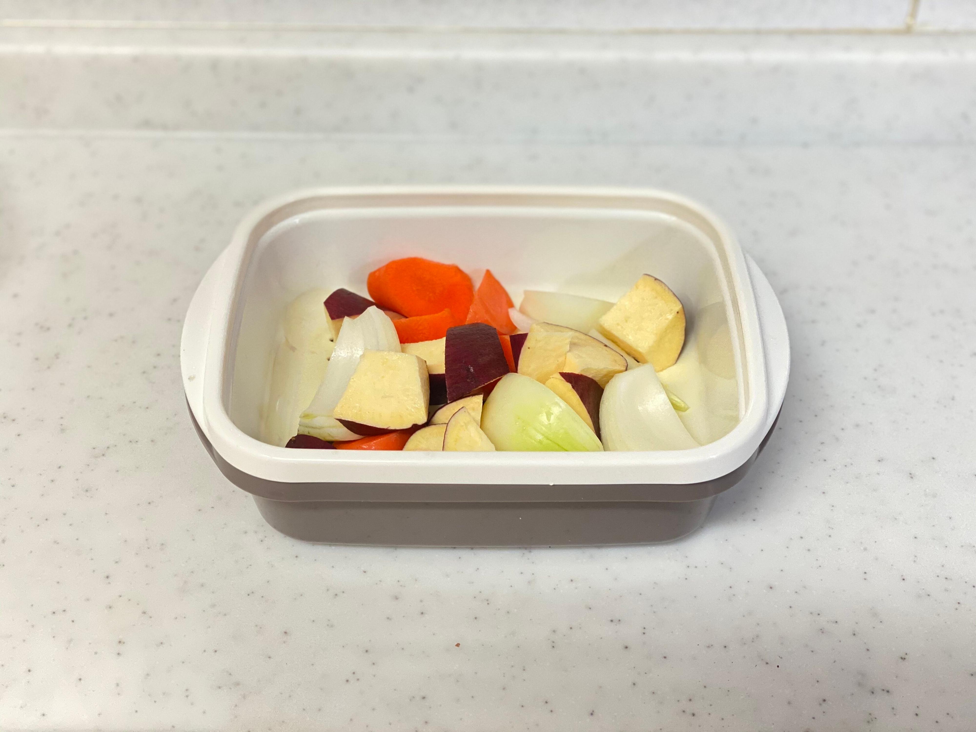 洗って適当な大きさに切った野菜を、容器に入れてレンジでチンするだけ!必要なのは野菜のみ!水も塩もいりません。この手軽さこそがズボラ主婦的ポイントです!5分もあれば美味しい蒸し野菜があっという間に完成しますよ。