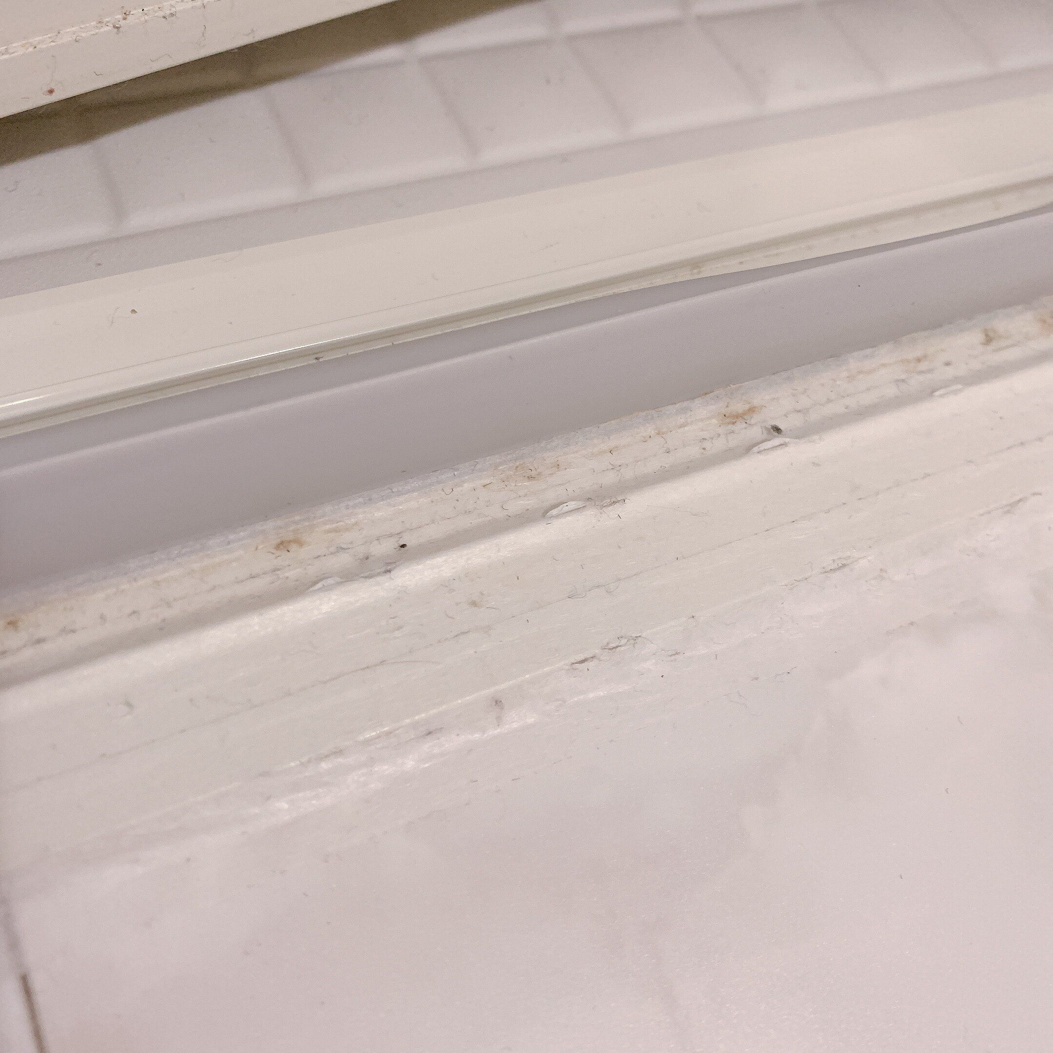 お風呂のドアの境目です。ここが意外と汚れるので、我が家は定期的に取り換えるようにしています。結構汚れが目立っていますが、テープを剥がすとこうなります。