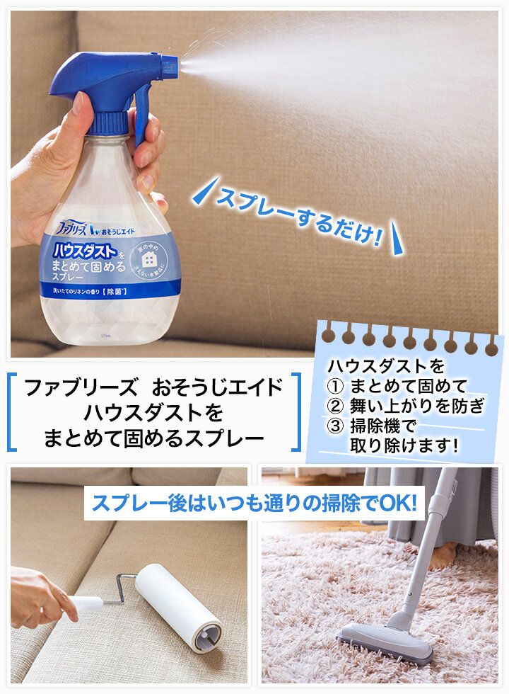 ハウスダストが舞い上がりやすいのは分かったけど、ただでさえ忙しい朝、プロのように丁寧に時間をかけて掃除するのは難しいですよね。そこでおすすめなのが、「ファブリーズ」から新登場した「ファブリーズ おそうじエイド ハウスダストをまとめて固めるスプレー」。その名の通り、スプレーするだけで布製品に付着しているハウスダストをまとめて固めてくれます。まとまって固まったハウスダストは掃除機や粘着クリーナーなどを使っていつものお掃除で簡単に除去できます。