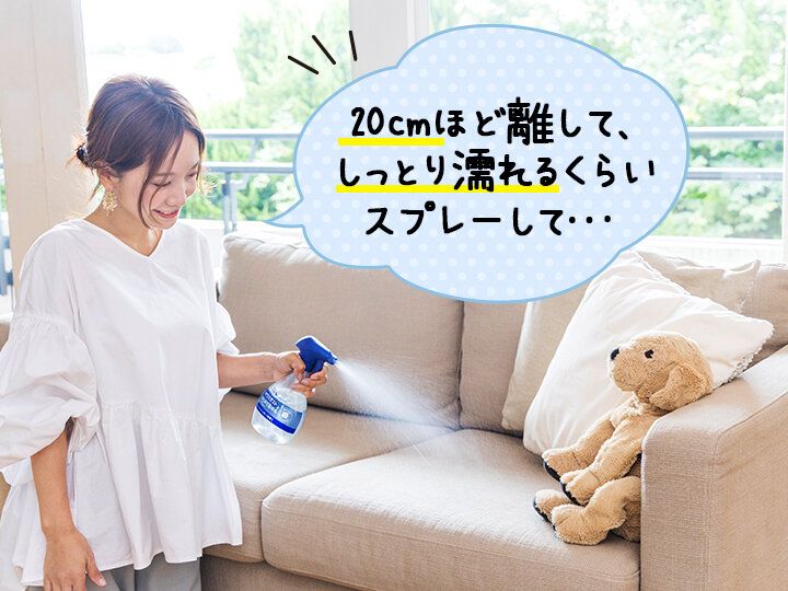 洗いにくい布製品に向かって、表面が全体的に湿り気を帯びる程度にスプレーします。