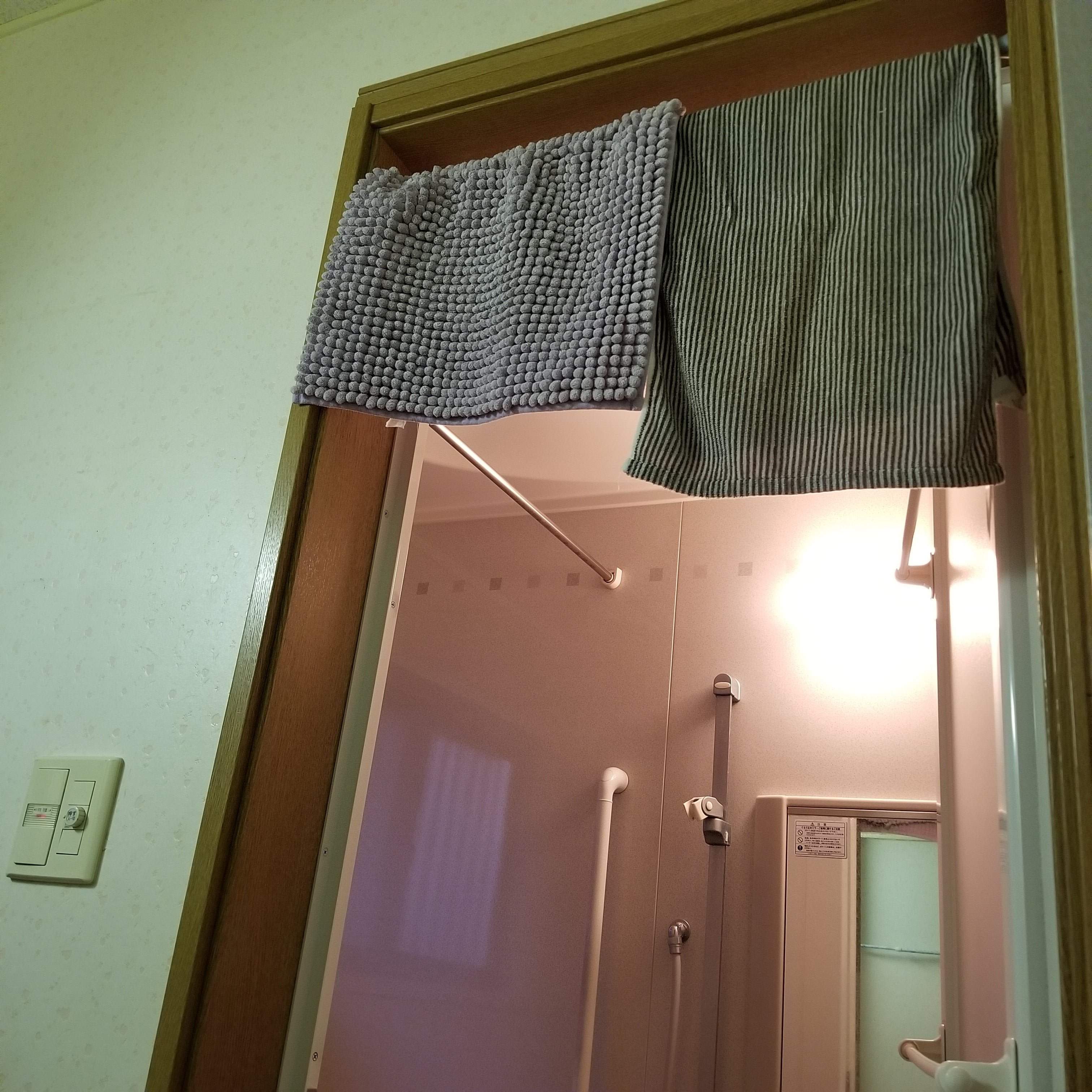 当時はまだバスタオルを使用していたので、『のれん感』がぬぐえませんでした。なるべく高い位置に突っ張り棒をした為に天井との隙間が少なく、物凄くタオルがかけにくかったです。