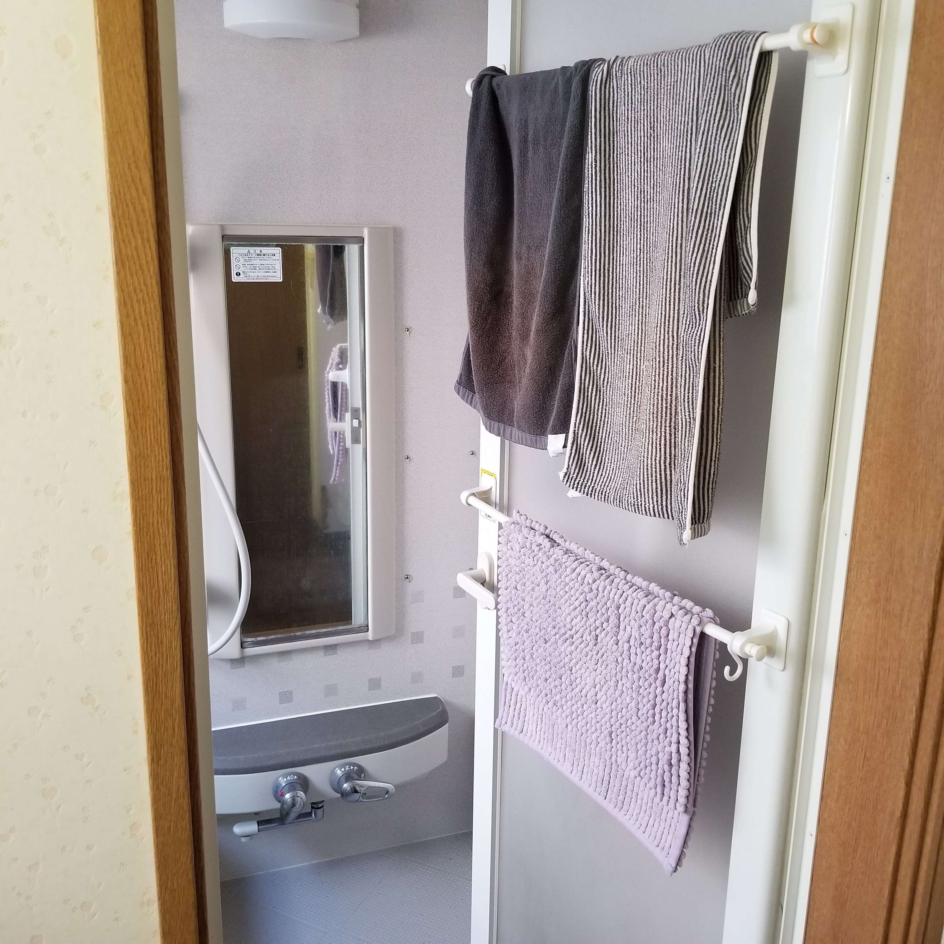 お風呂のドア枠だけに突っ張り棒をしましたが、かけられる量が少なすぎて、これはすぐやめてしまいました。