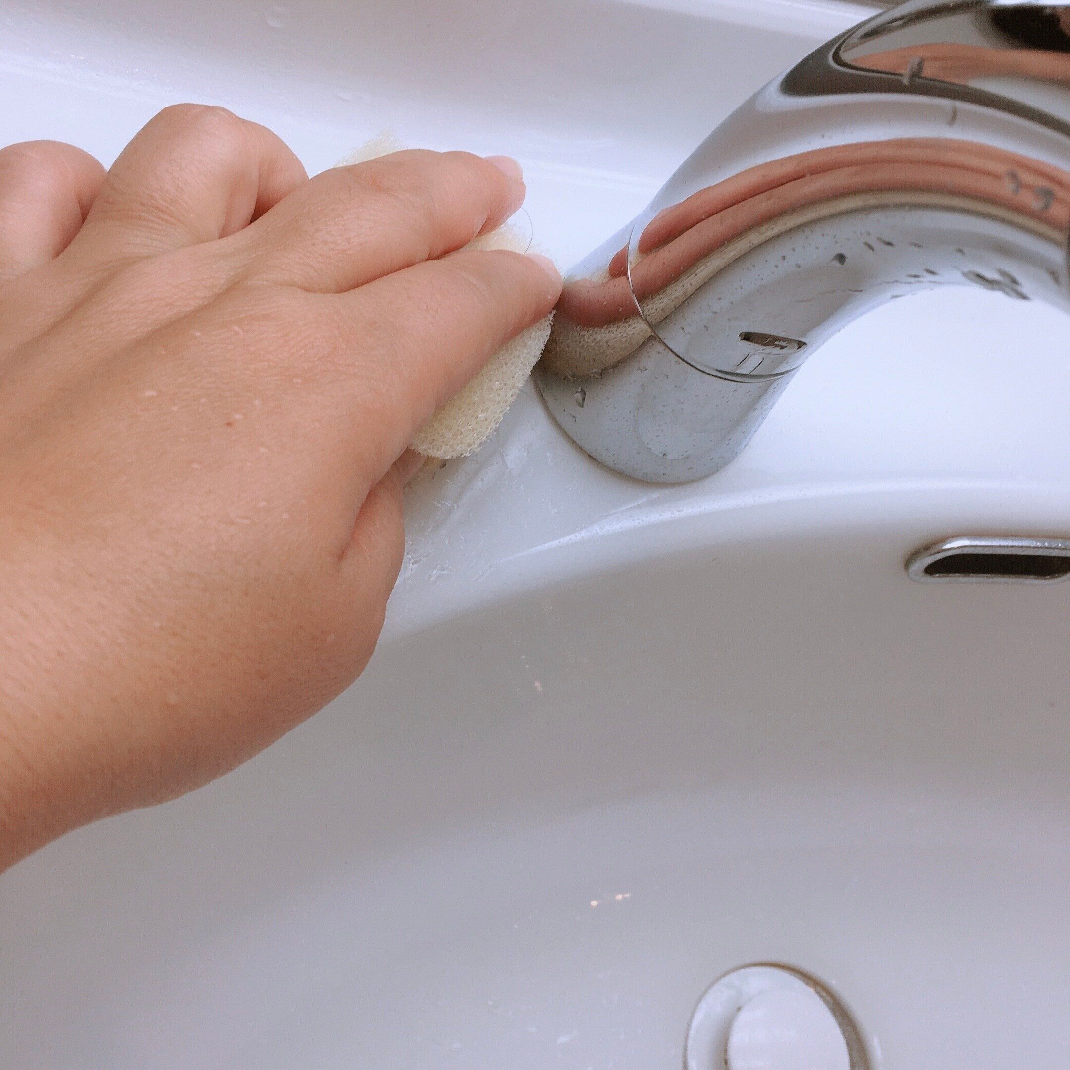 次にスポンジでスプレーした場所をスポンジまたは布でこすりながら塗布していきます。蛇口と洗面台とのつなぎ目や、蛇口の向こう側などふだん掃除をしにくい箇所を重点的にやっています。終わったら水で全体のコーティング剤を流し、最後に乾いた布で拭き取り完了です。