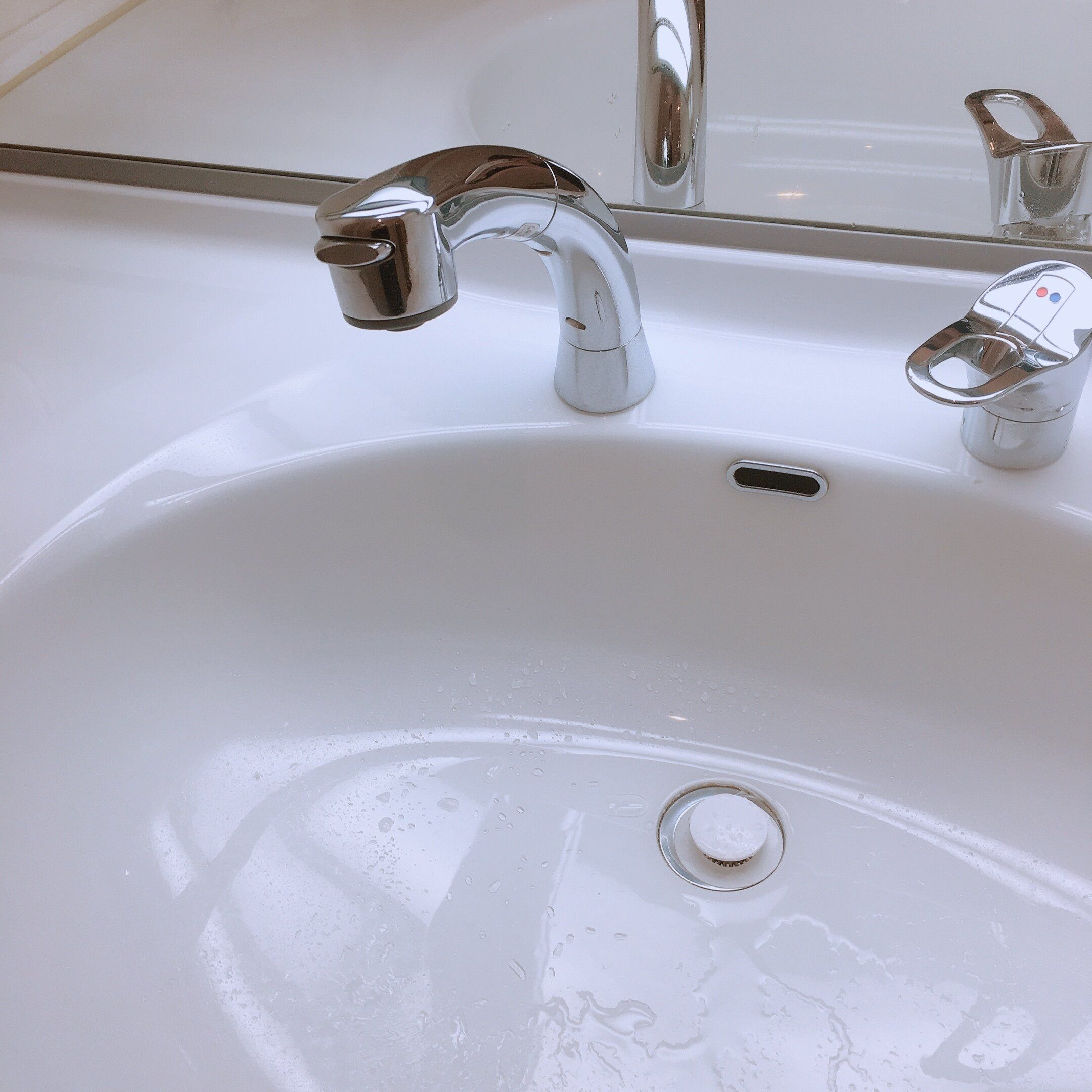 まずは洗面台の掃除をします。お風呂用の中性洗剤を吹きかけて蛇口部分、洗面ボウル、洗面台をスポンジでこすり、水で流します。鏡はマイクロファイバークロスで全体を拭いて完了。