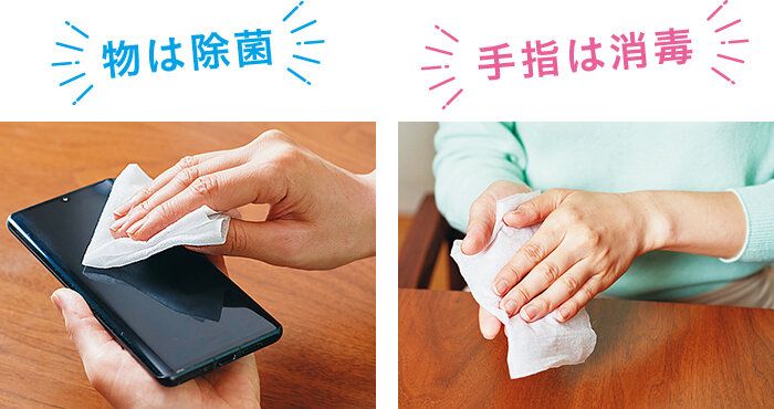 外出時は、バッグの中に携帯用のウェットティッシュを常備。手が洗えない場所でもすぐに消毒(※1)できるから安心です