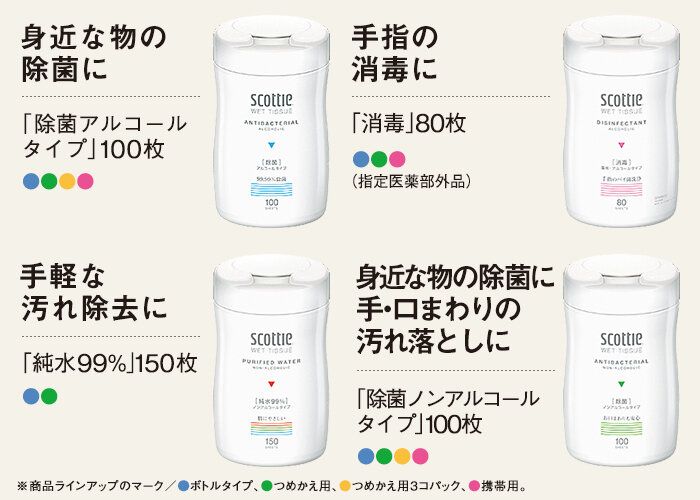 充実のラインアップが魅力の「scottieウェットティシュー」シリーズ。消毒ができるウェットティッシュー(※1)は、家の中でも外出時でも大活躍。たっぷりサイズのボトルタイプと携帯用で、いつでもどこでも清潔を保てます。