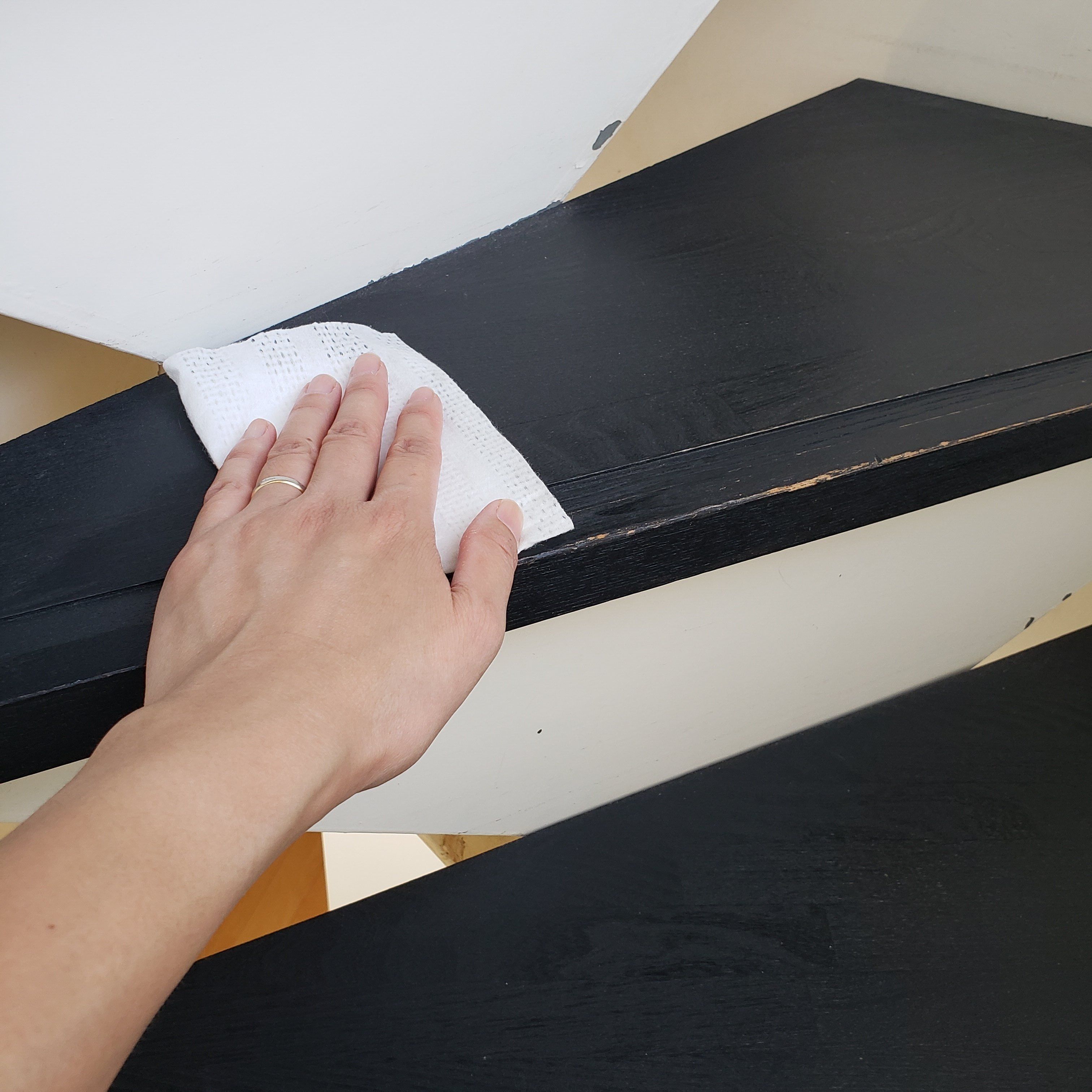 こちらを使って、階段の拭き掃除をしてみました。サイズは手のひらくらい。拭いていてもすぐに乾きます。シートが凸凹してますので、ホコリやゴミをからめとってくれます。