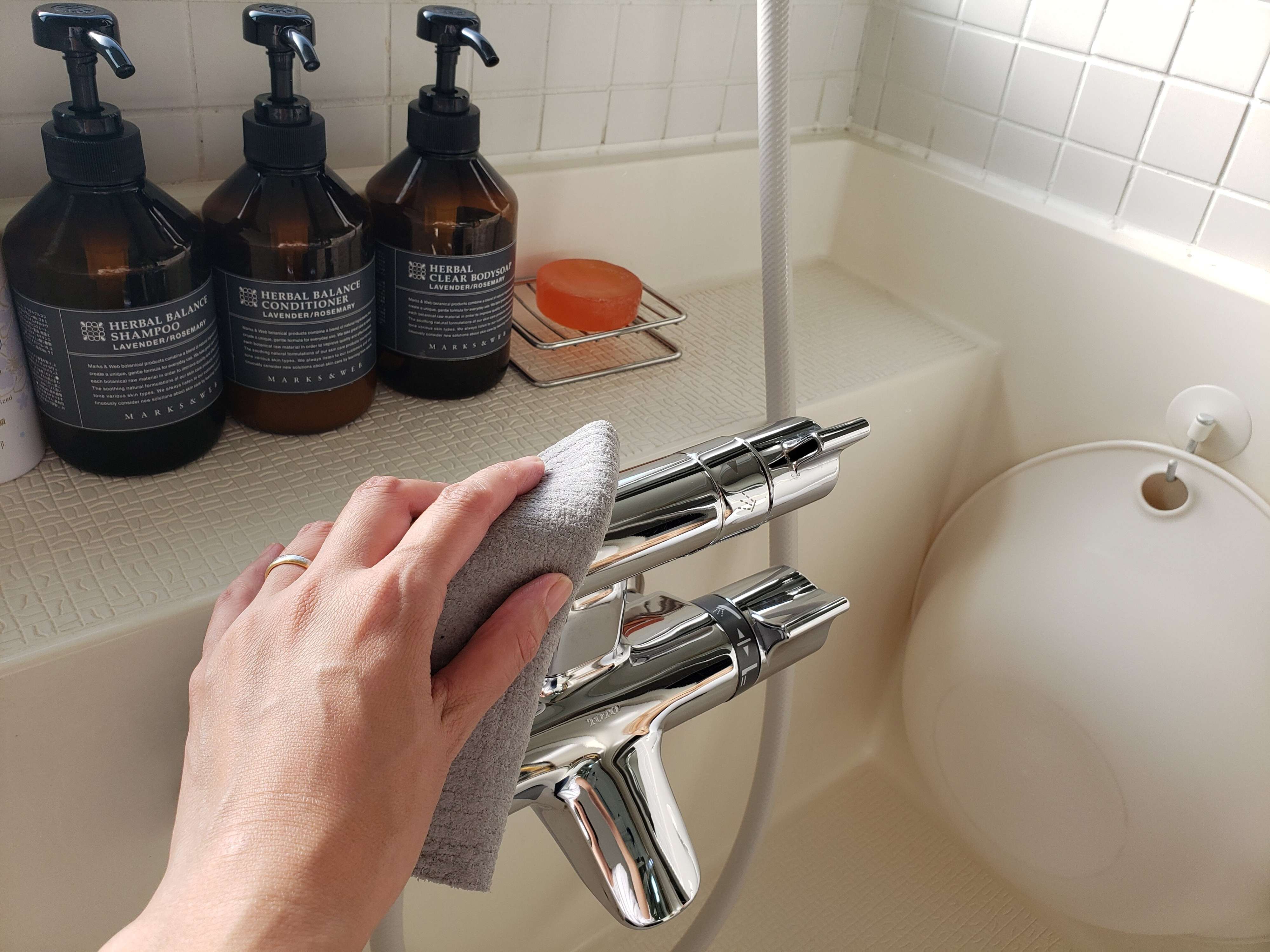 金具部分がキレイなだけで、手入れされているなぁという印象を受けますので、浴室だけでなく、洗面所やトイレ、キッチンなどの金具ものは、1日に1度は水気を拭き取るように心がけています。