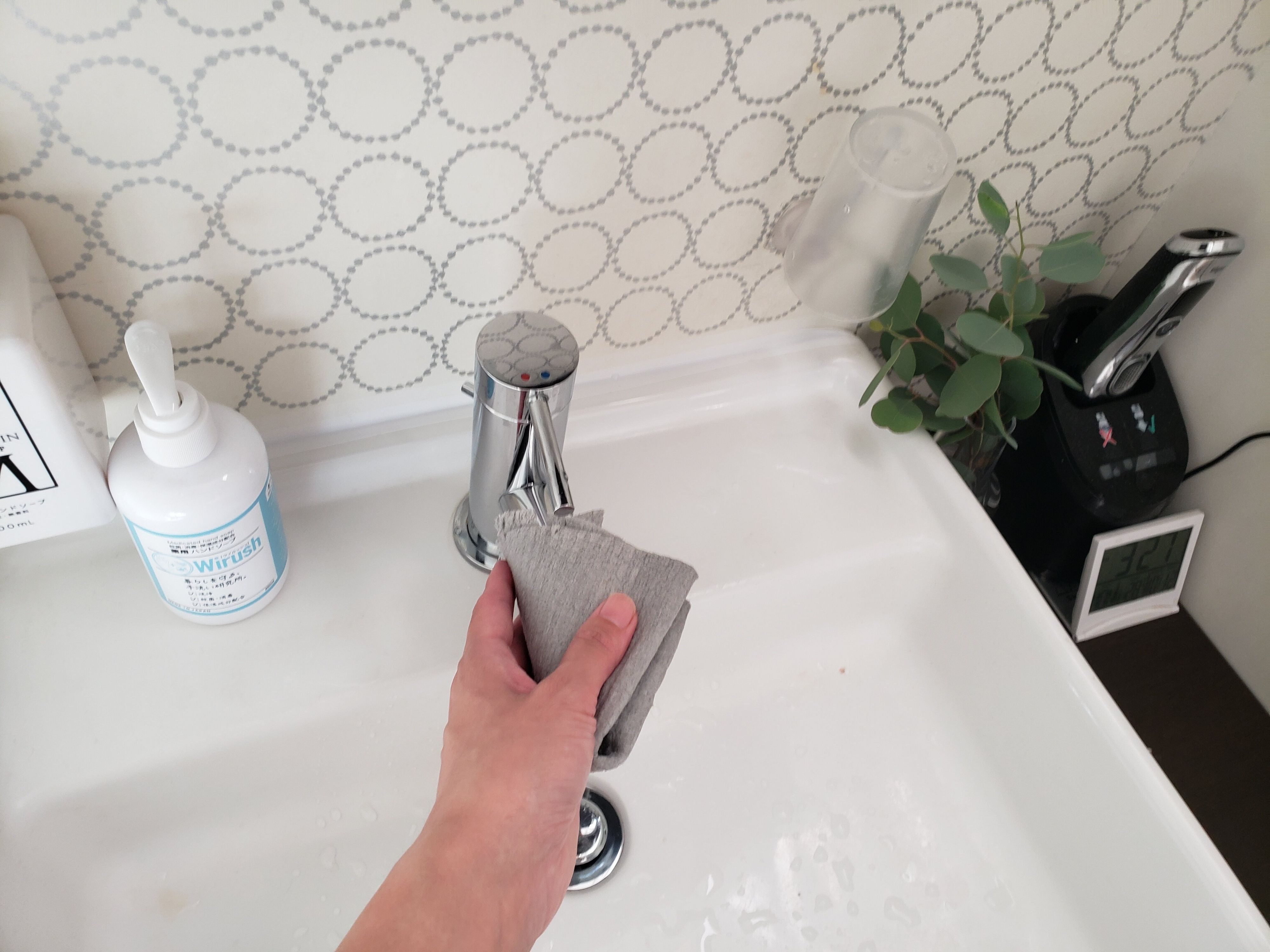 水垢対策としてこちらのドイツふきんでサッと拭くだけで、水垢ができにくくなります。水分を残すことが水垢を作るもとなので、今回はドイツふきんを紹介しましたが、おうちにある布でも何でもいいんです!とにかく1日に1回サッと拭けばOK。
