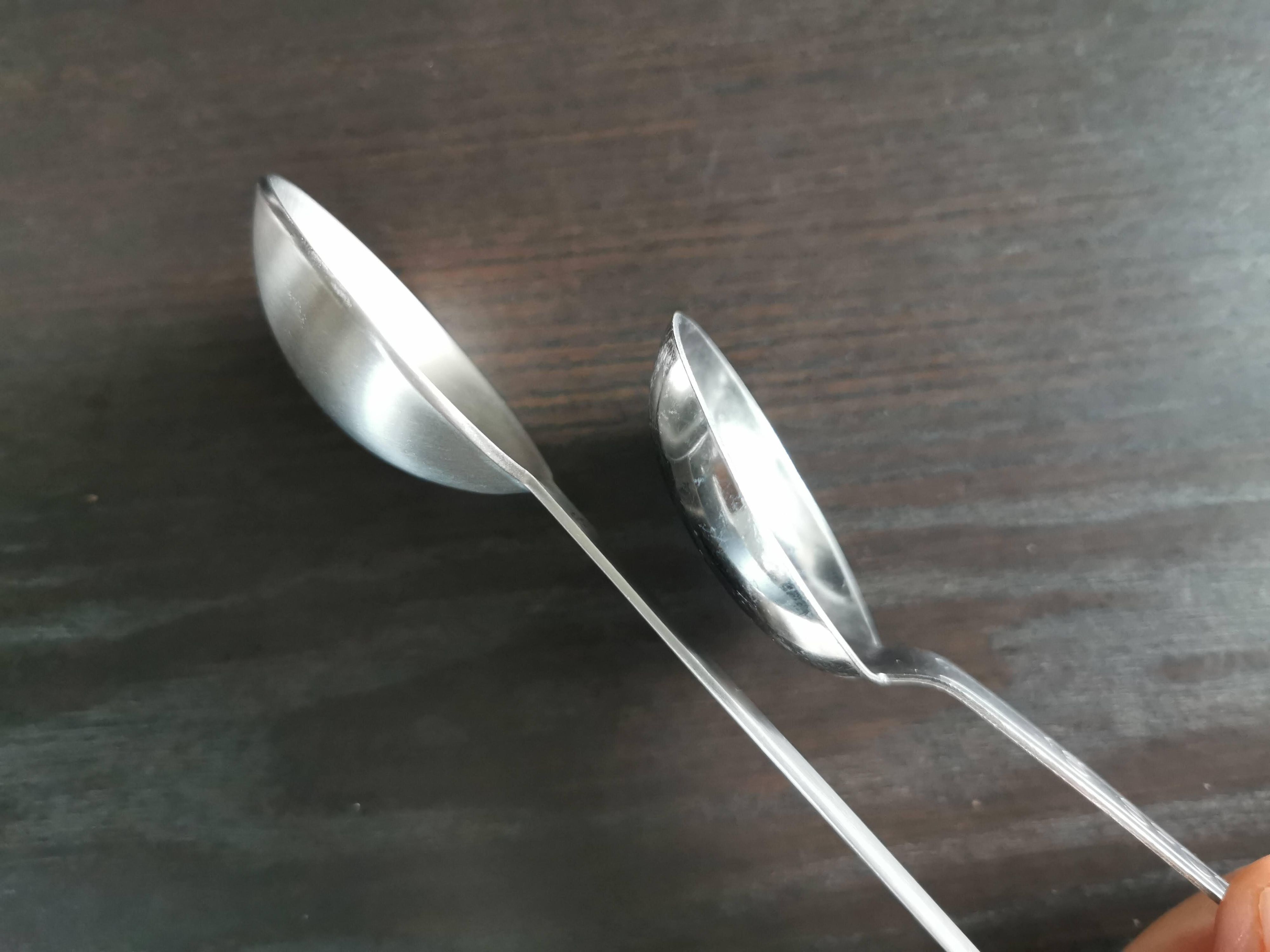 それが、この絶妙なカーブ!深すぎず、浅すぎず、だから粉ものも汁もの、きっちり計ることができるんです!100均のものと比べると微妙な差がわかります。