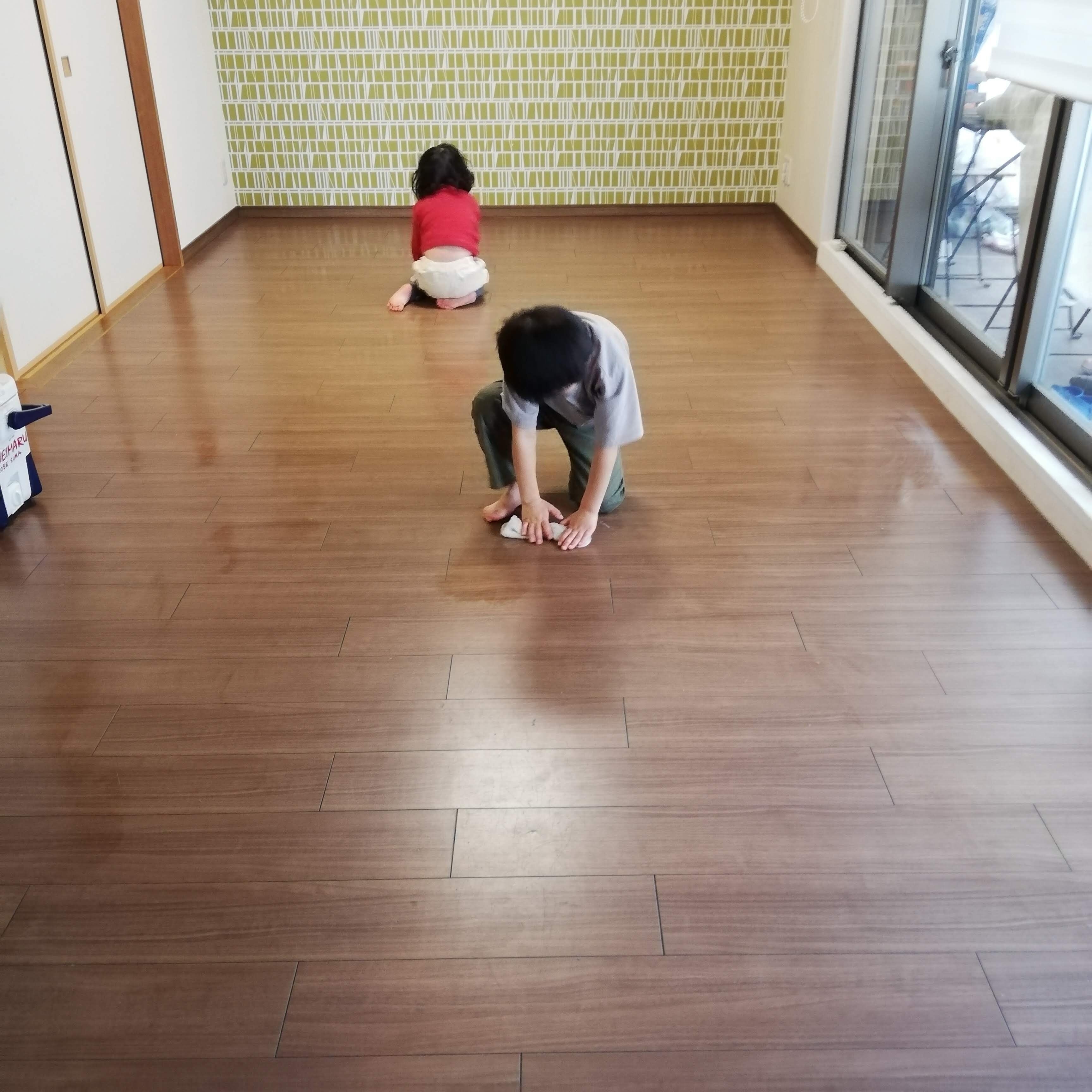 そこで、1番簡単でとりかかりやすい雑巾掛けをしてもらうことにしました。子どもにとっては、ひとつの遊び感覚。