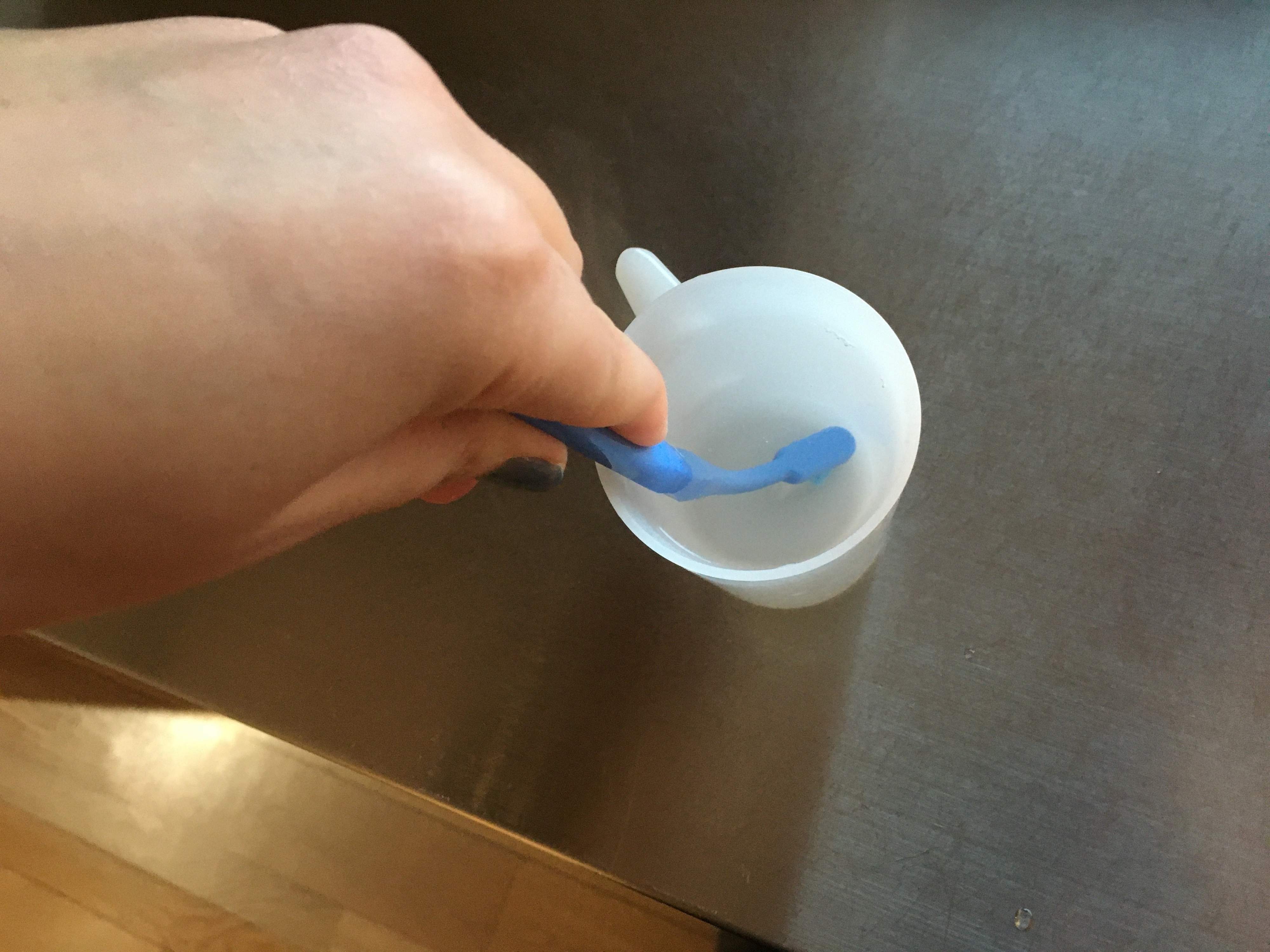 歯ブラシを熱湯に入れ、上からグッと押さえつけます
