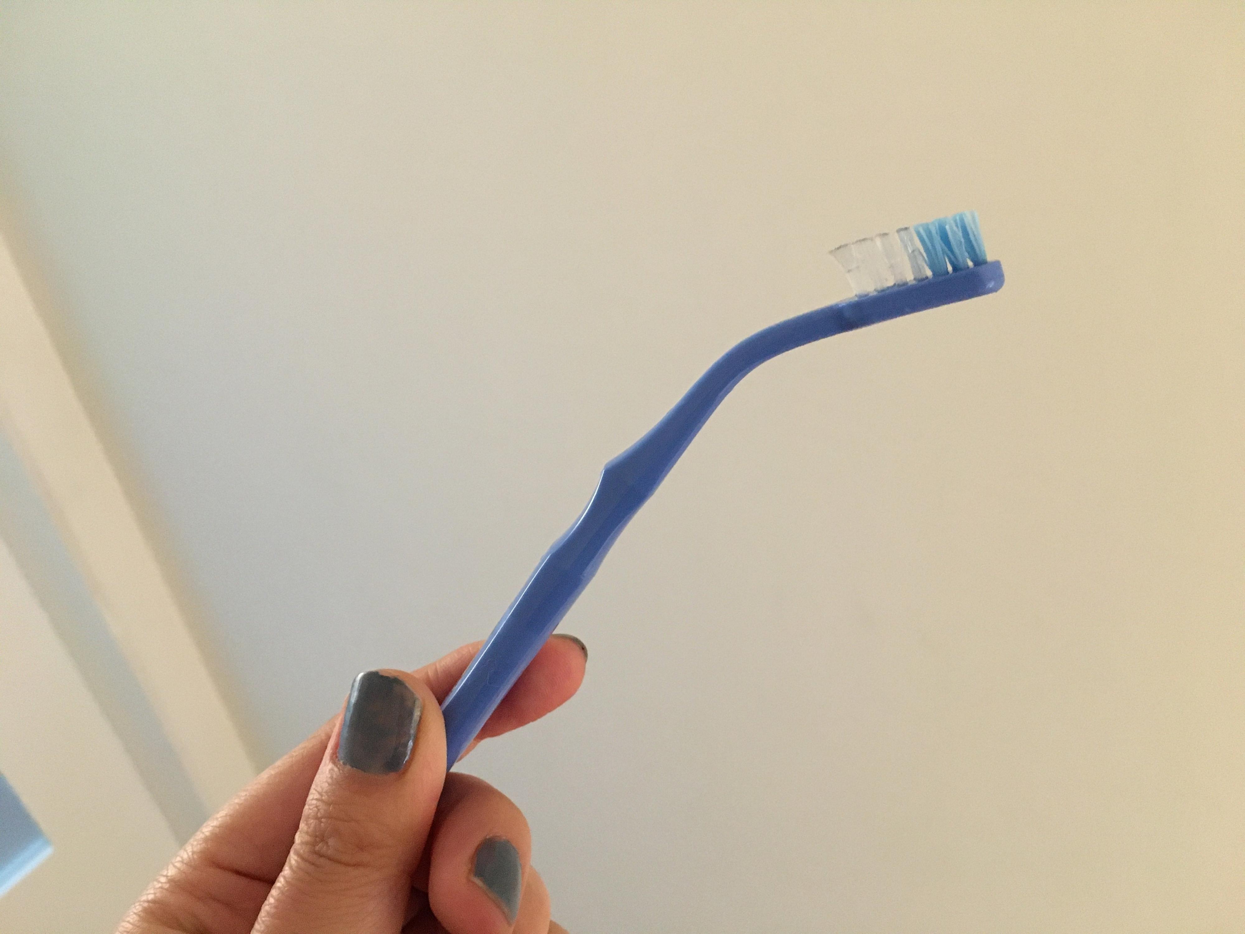 まずは歯ブラシの首部分を曲げて「への字ネック」をつりましょう。狭い隙間にも入り込みやすくなり、隅までしっかり掃除できますよ。
