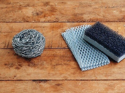 金属たわしなどを使って力ずくで落とそうとすると、鍋のコーティングがはがれたり傷がついたりして、鍋の寿命を短くします。編みたわしやオールウレタンのスポンジなど、こすっても傷つかない物を使いましょう。