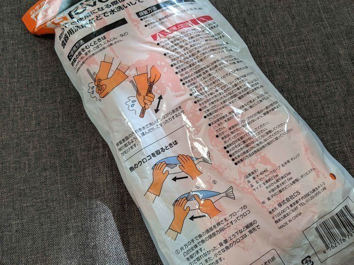 使い方は、袋の裏にもあるように、手袋をはめてこするだけ!これだけでカンタンに、みるみるうちに野菜の汚れや皮、魚の鱗が取れちゃうんです。