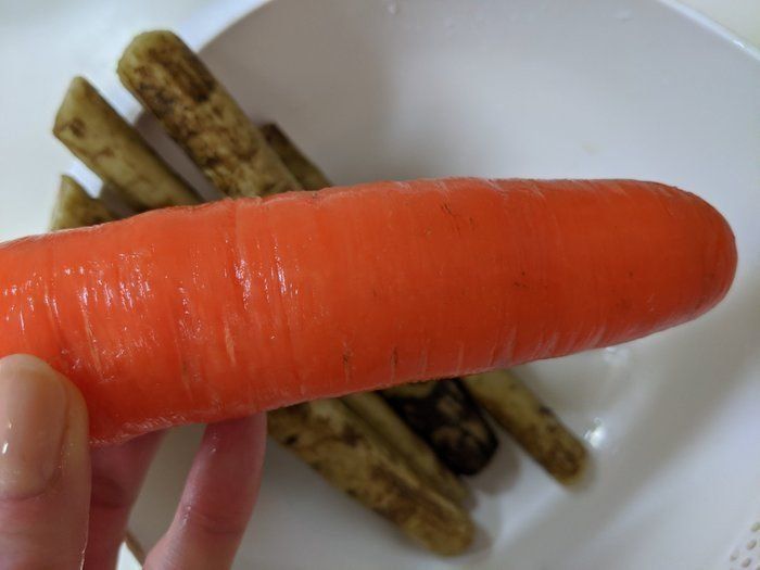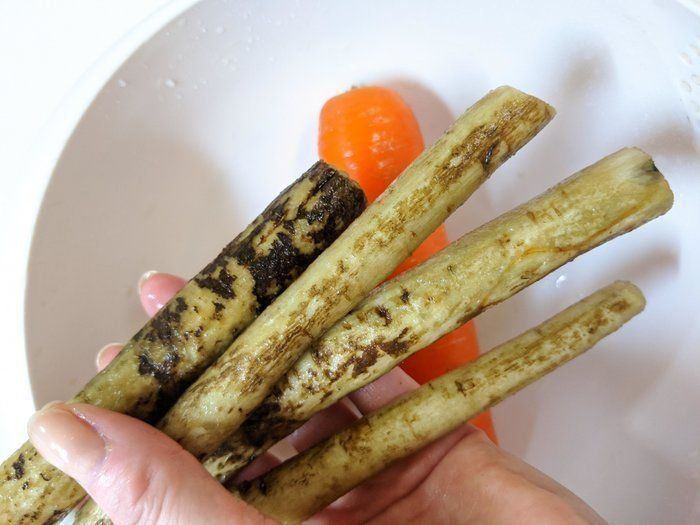 ごぼうは上のほうはすんなりとれましたが、下の太いほうは強めにこすりました。