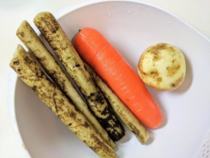 この泥つき人参、じゃがいも、ごぼうたちを皮むき手袋でひと撫で、ふた撫ですると………!