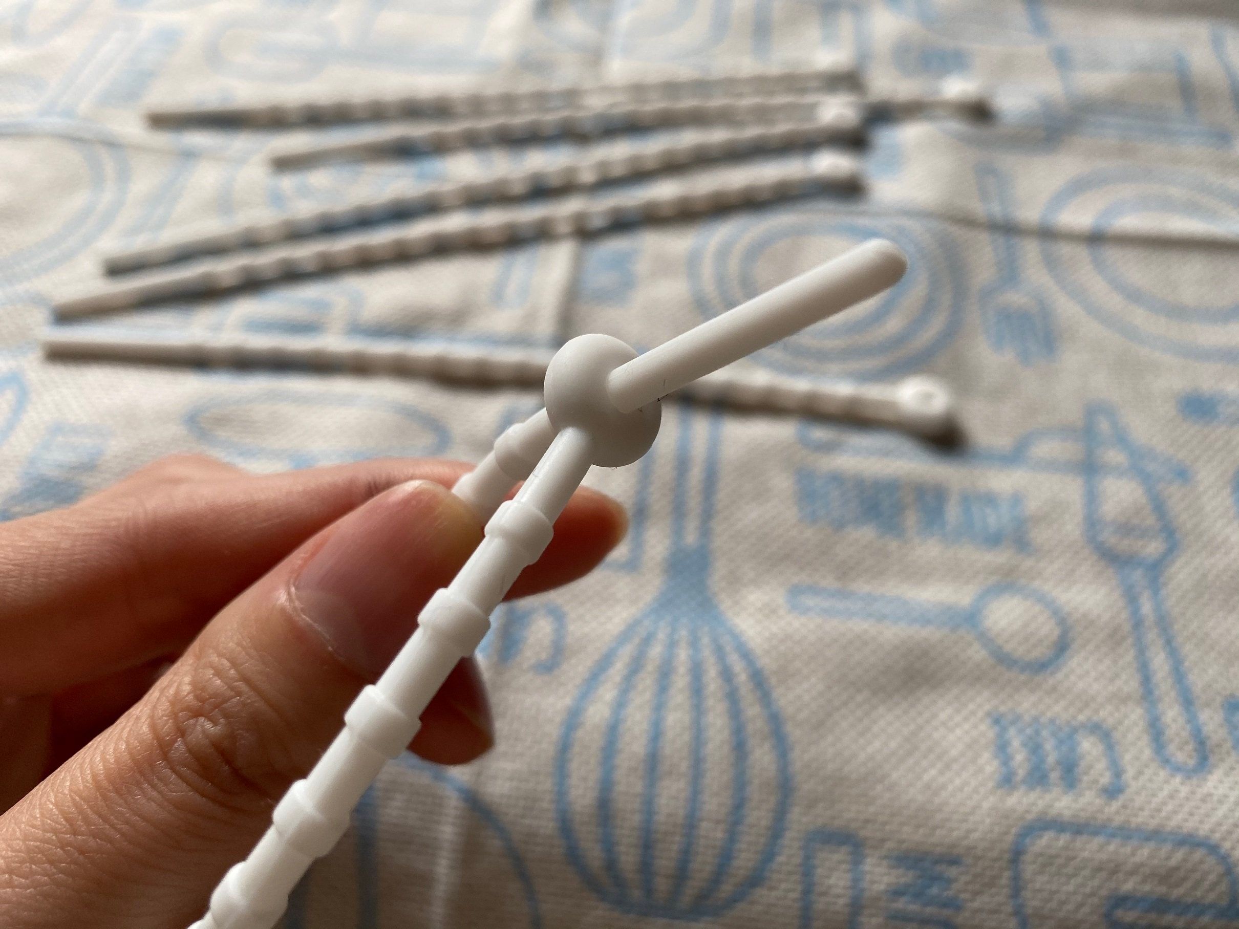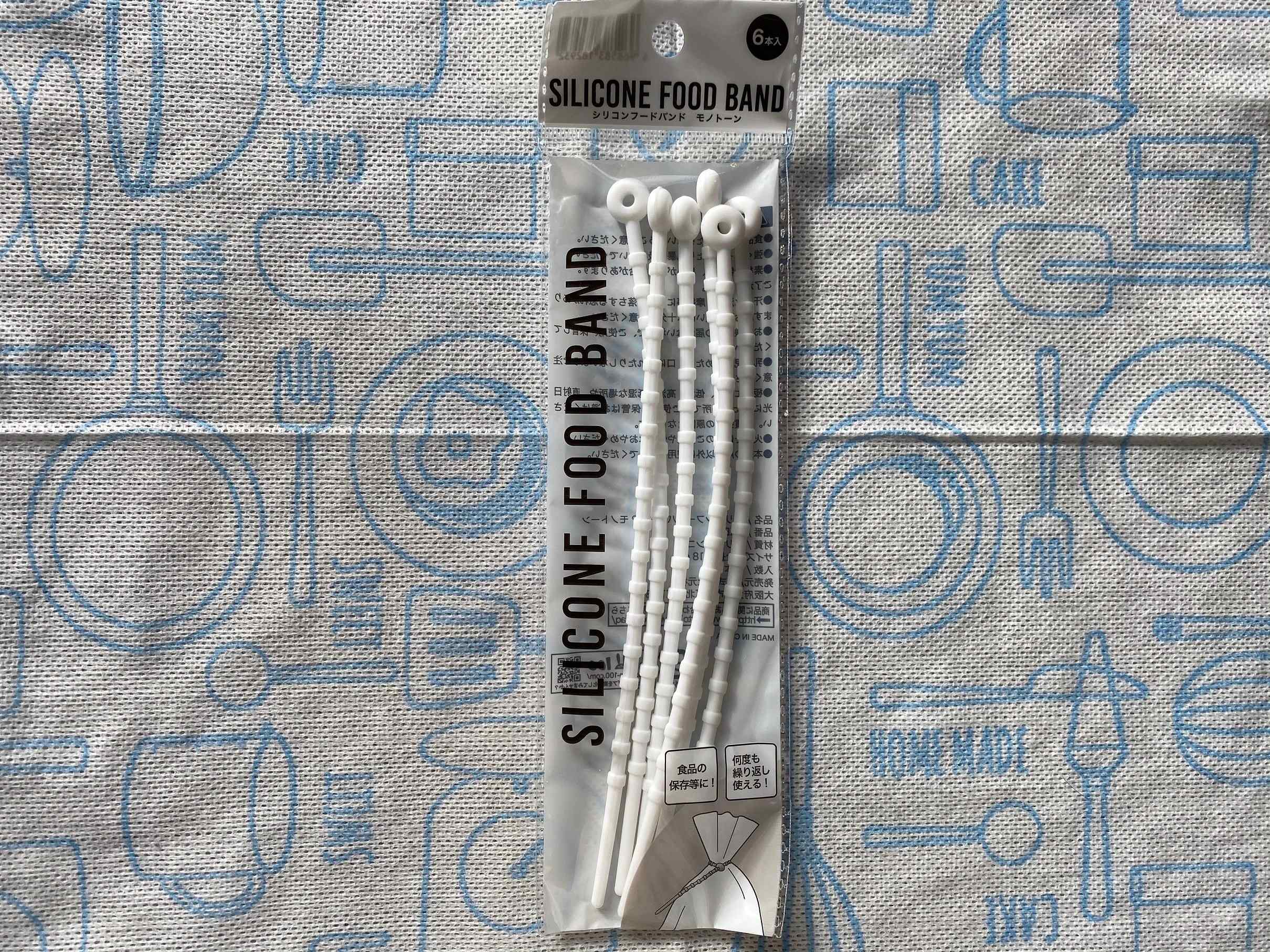 開封したお菓子の袋などをとめるのにピッタリなのが、こちらの「シリコンフードバンド」。長さが18cmあるので、大袋のお菓子などもとめられます。使い方はカンタン。写真のように、バンドを輪っかの形にしたて先端の穴に通したら、ギュッと締めるだけ。子どもでも問題なく使うことができます。