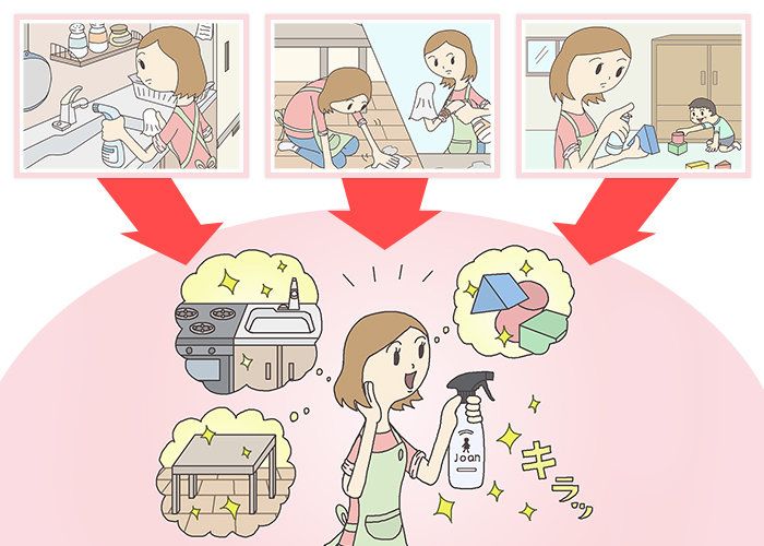 これからは、除菌も抗菌も「クイックル Joan」1本! 使う場所を選ばないスプレータイプがあれば、気づいたときにササッとお手入れできます。手間が減るのはもちろん、1本で済むから節約にもなるスグレモノです。