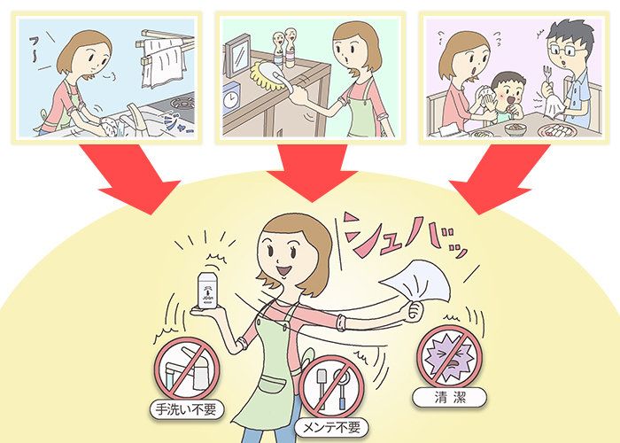 使い方は超簡単! 食卓などに直接スプレーして、きれいな布などでふき取るだけ。子どものおもちゃなどのこまかいすき間には布にスプレーしてきれいにふいてあげれば完璧です。二度ぶきは不要なので、家事の効率化がはかれて、時短にもつながります。