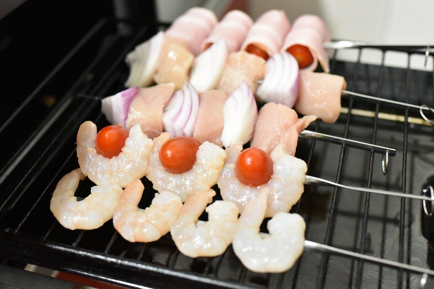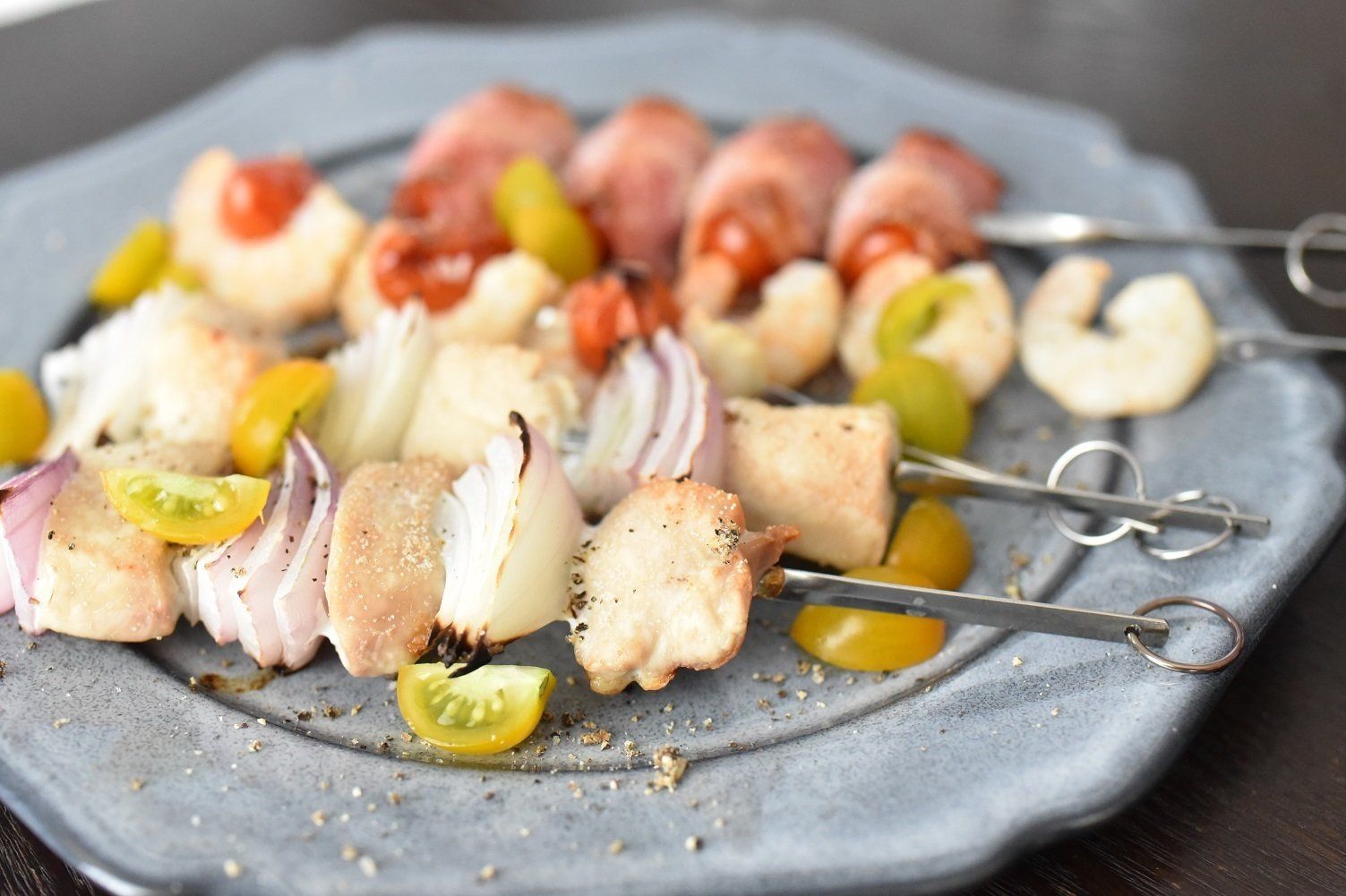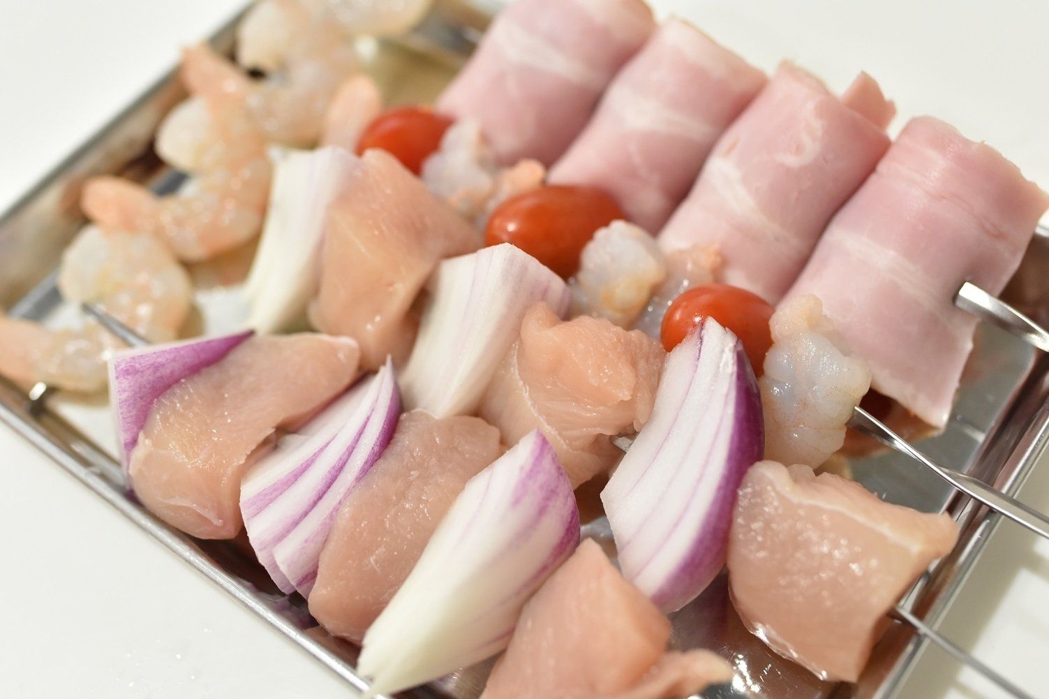 今回つくったのは、トマトをベーコンで巻いたもの、エビにトマトを抱かせたもの、鶏肉と紫玉ねぎを交互に刺したものの3種です。