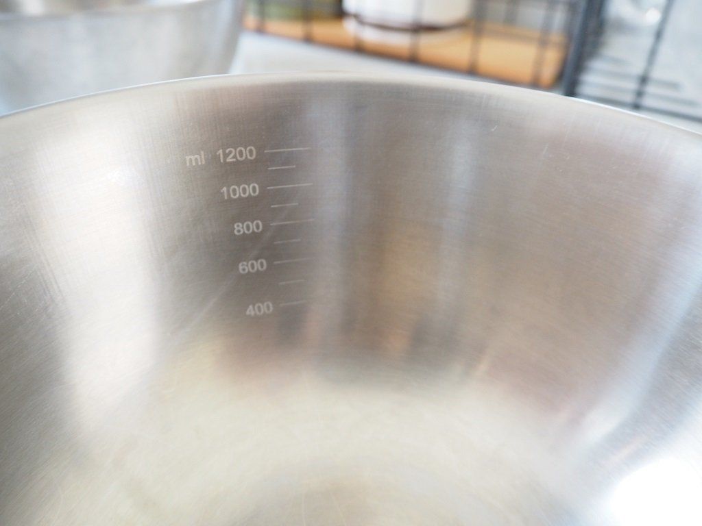 ニトリのステンレスボウルは、今回紹介したすべてのサイズで目盛りがついていました。24cmのボウルは3400mlまで計れるので、お水やおだしを一気に軽量したいときに便利ですね。