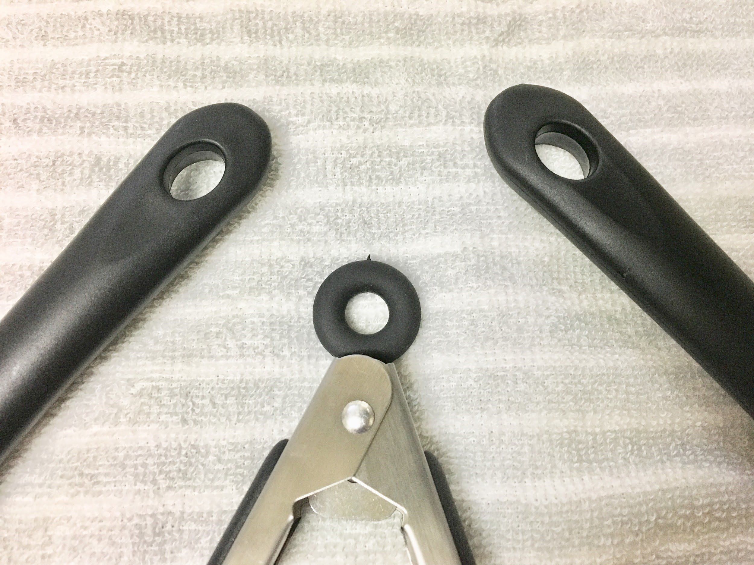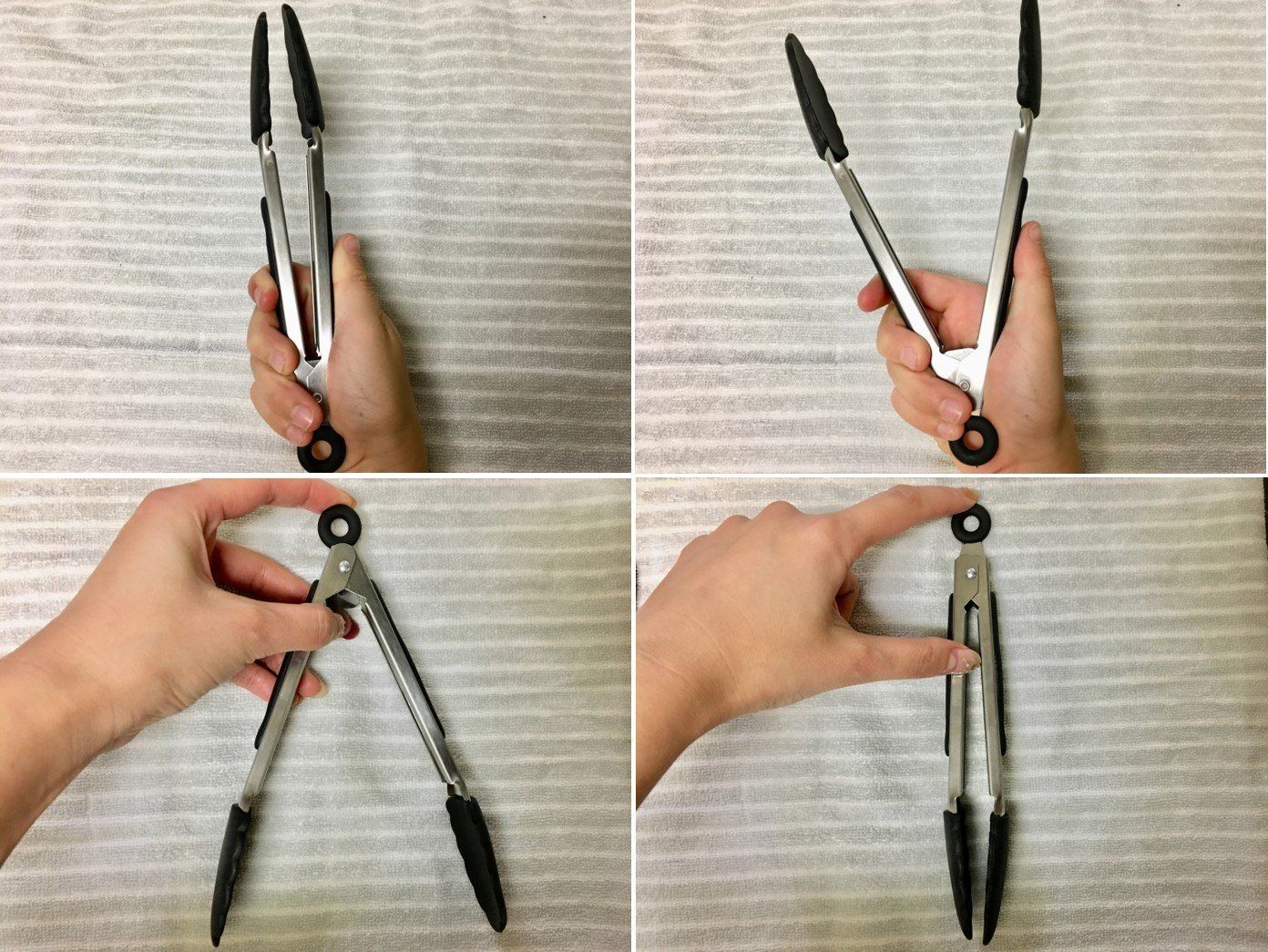 画像のように、先端の黒い丸部分を下に押すと開きます。子どもに持ってもらいましたが、ミニサイズだから開いた状態でも無理なく持てるので、ラクラクで挟めます。