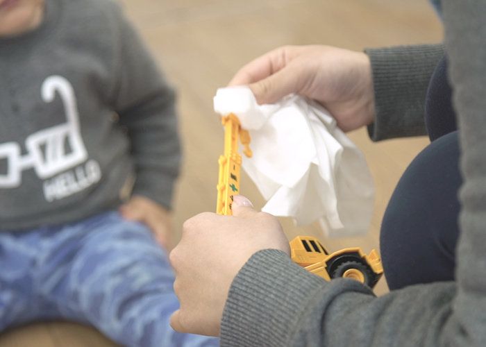 子どもたちが触れる場所・モノを徹底除菌!おもちゃは一つ一つていねいにふく