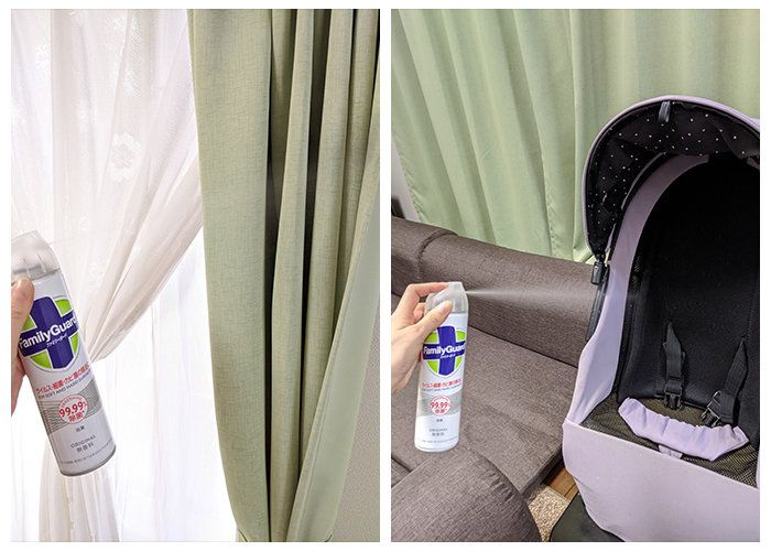 最初はスプレーの噴射が強くてびっくりしたのですが、粒子が小さいからか一カ所に集中してふき付けられることがなく、全体にまんべんなく広がるのを実感。カーテンは面積が大きいから、全体を除菌するのは時間がかかるのでは?と思っていたのですが、予想以上に短時間で手軽に除菌できました」(中島さん)