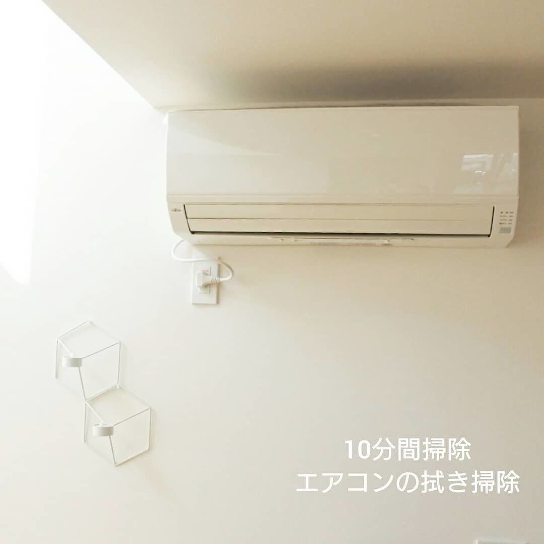エアコンの拭き掃除も10分間でできちゃいます!フィルターや細かな部分の拭き掃除。壁と本体の隙間を綿棒で埃取り、コンセントまわりの埃も拭き掃除して清潔な状態になります。