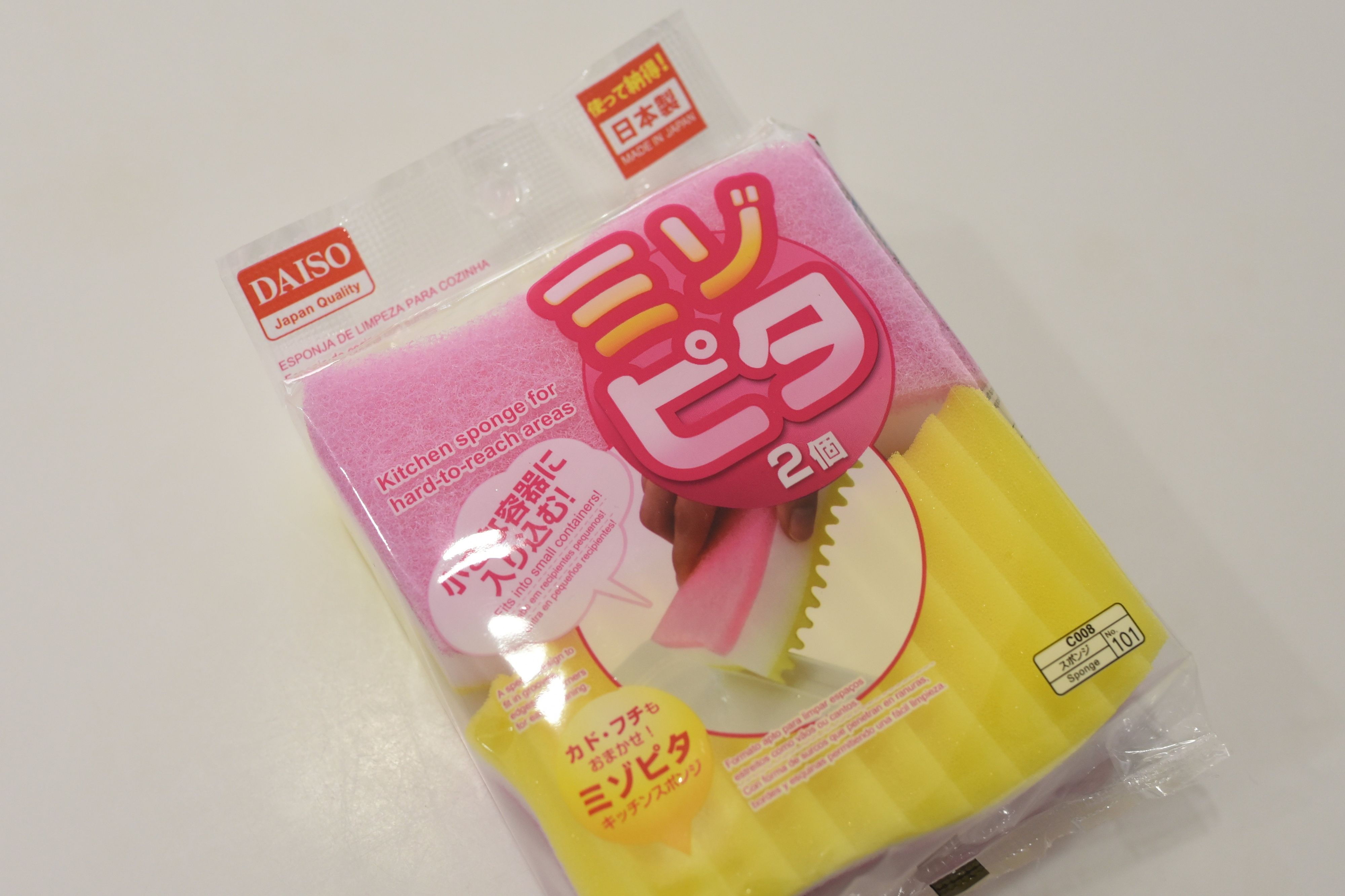 ダイソーで2個入り108円(税込み)で販売されている「ミゾピタ」。握りやすいカーブのある形状で、黄色、白、ピンクのかわいらしい色合いです。
