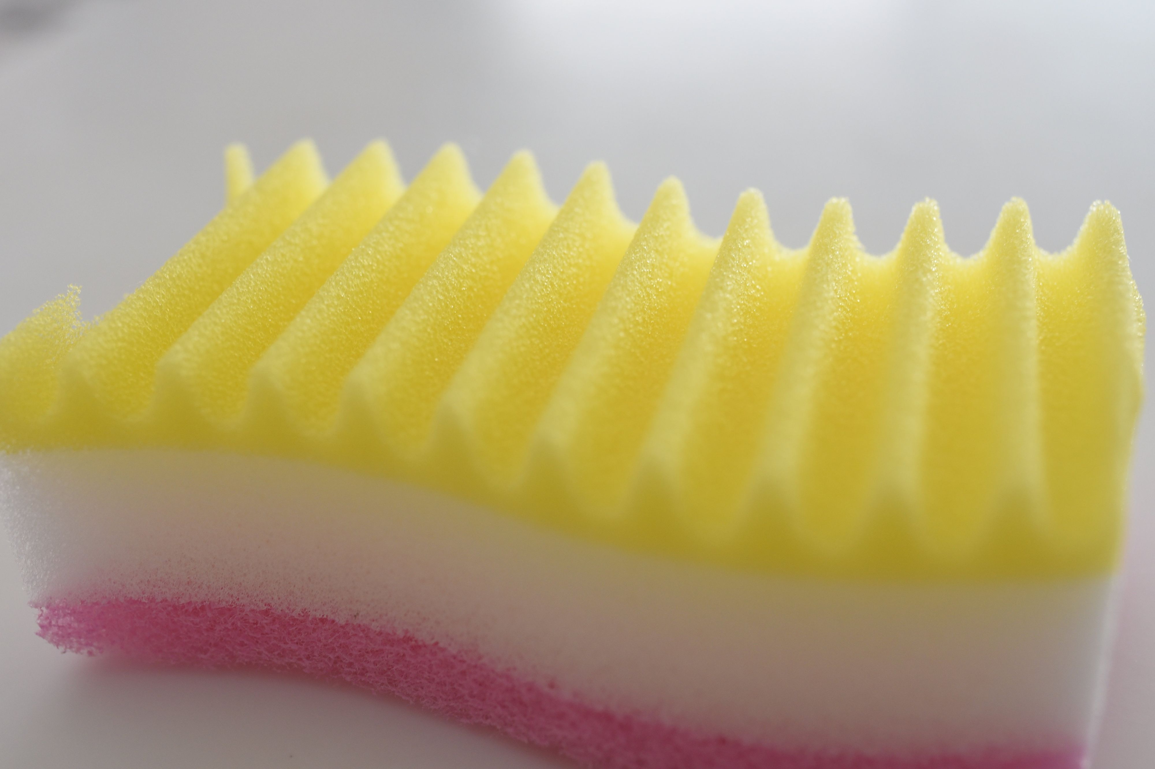ポイントは、黄色い面のこのミゾ。深さ8mmほどの深めの溝が均一に入れられています。このミゾが、平面のスポンジでは届きにくいところに入りこんで、汚れを落としてくれます。サイズは長さ約11cm、幅約6m、厚み約4cmで、小柄な手でもしっかり握れるサイズになっています。