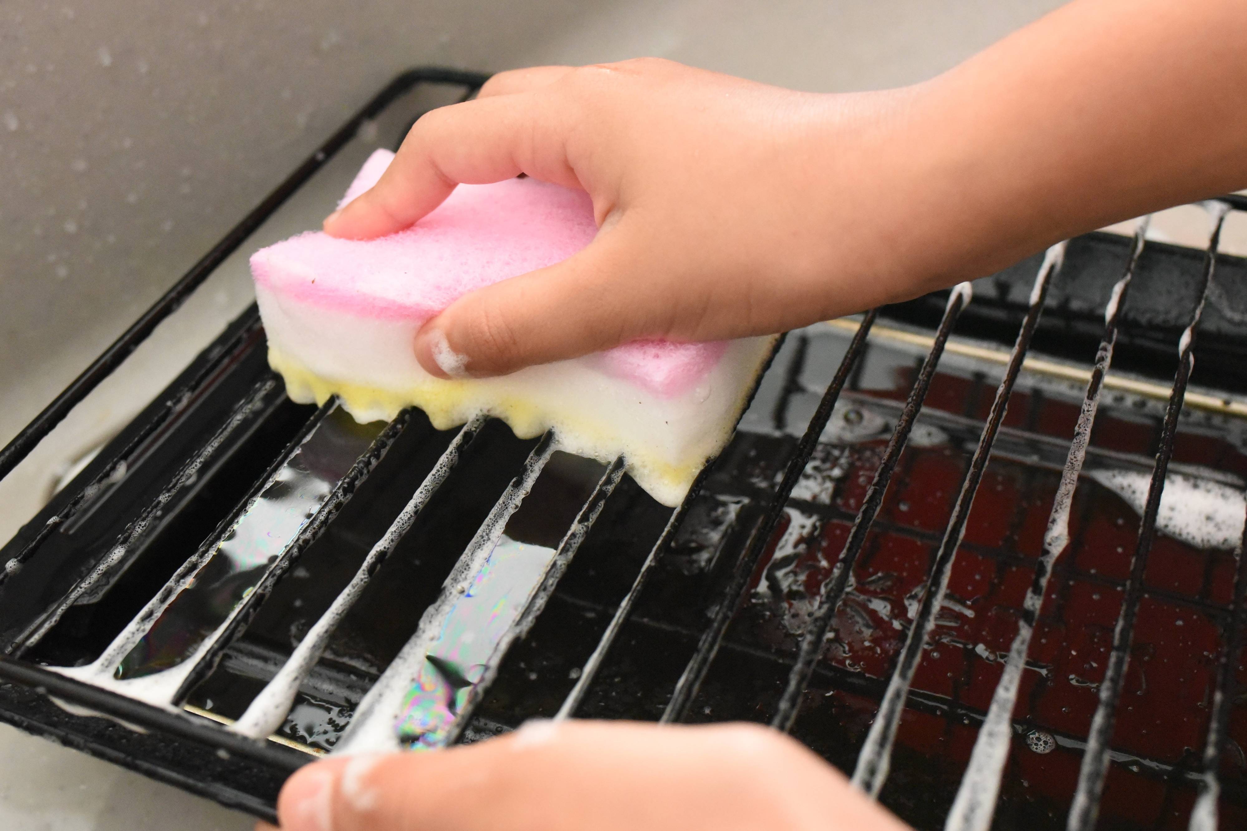 このスポンジのミゾを活用して洗いやすくなったと感じているのが、魚焼きグリルの網です。今まではステンレスの棒を一本ずつ順番にスポンジでつまんで洗っていたのですが、このスポンジにしてからは、滑らすようにスポンジをスライドするだけで、端からは端までしっかり汚れを落としてくれます。