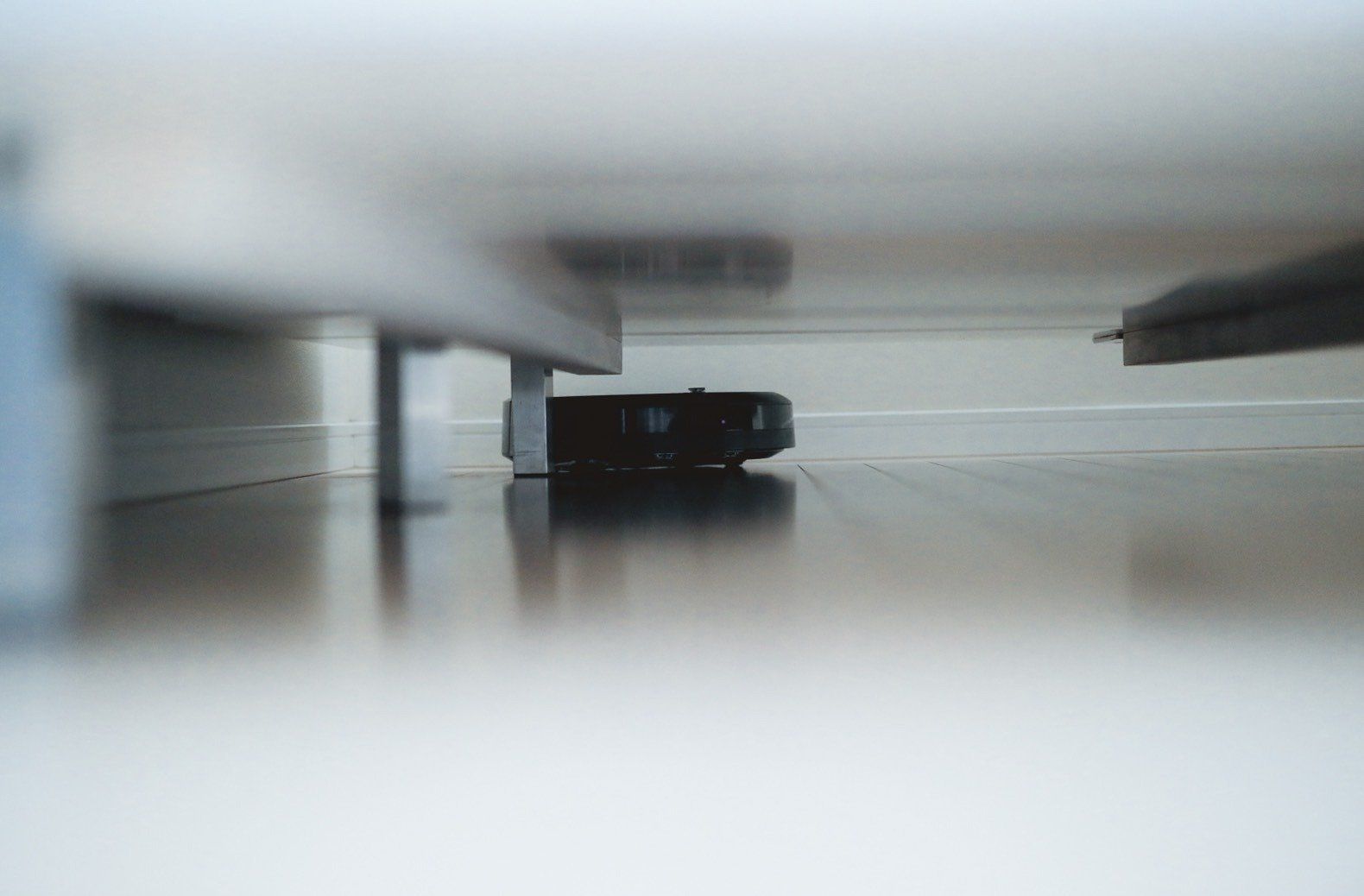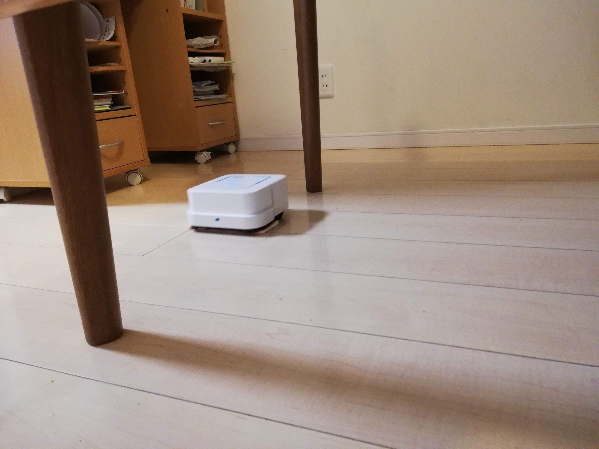 ごはんのしたく前、おふろに入っている間に、部屋はブラーバがお掃除。リビングからキッチンにも入り込んで水拭きをしてくれていて、おふろから上がったら、揚げものをよくやるキッチンの床もピカピカに。 コンパクトサイズで音も静か、リビングにもなじんでるとか。