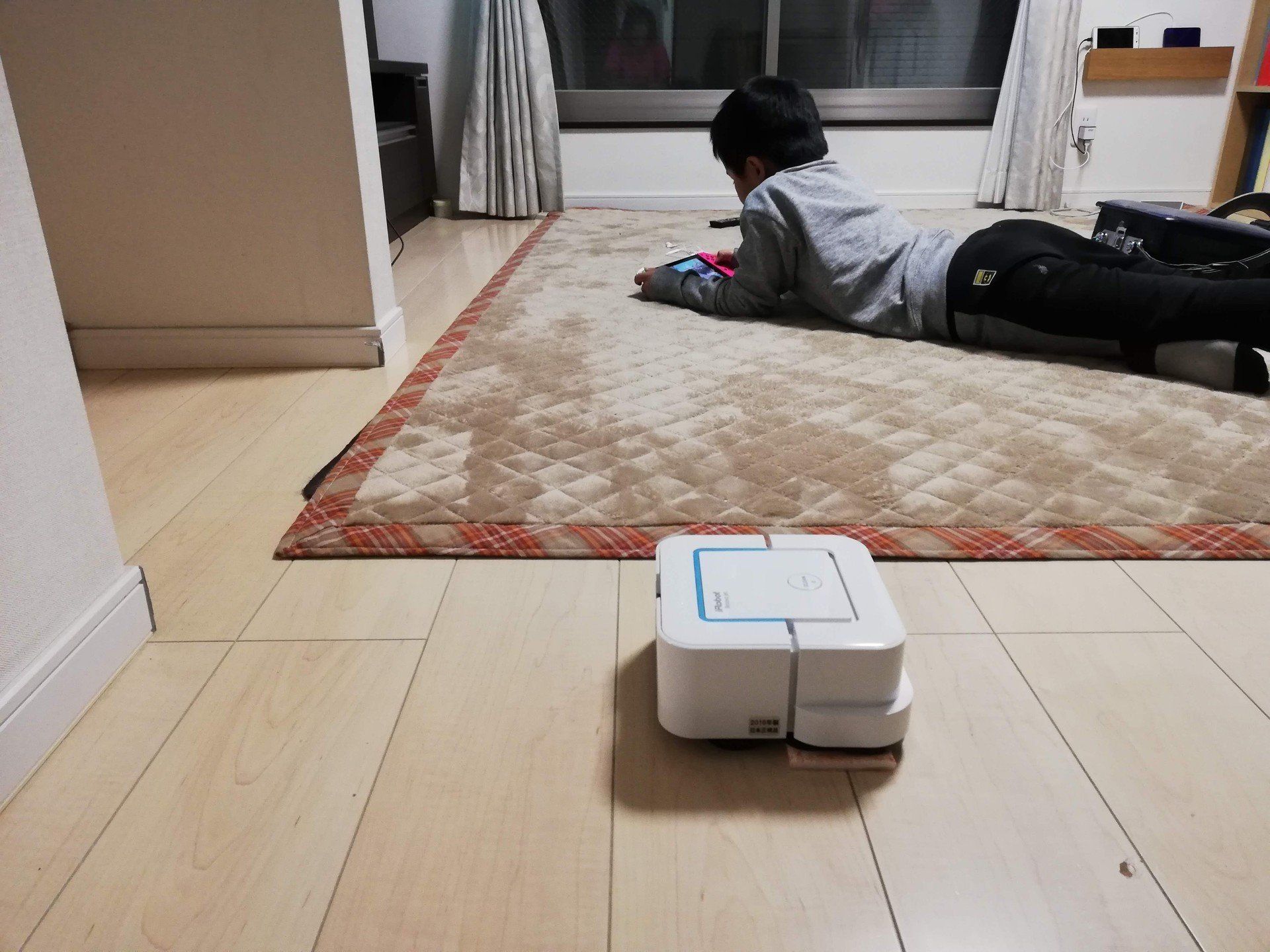 ブラーバの初稼働は、仕事から帰って息子のコジくんがゲームをしている横で! まずは、ジェットスプレーで水を噴き付けてからクリーニングヘッドで拭き取る「使い捨てダンプスィープパッド」を使用しました。