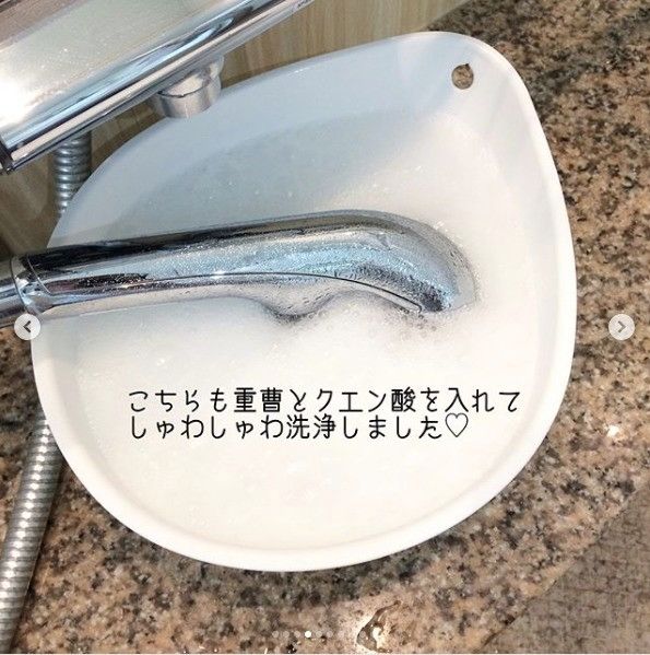 まずは蛇口と同じように、重曹とクエン酸を入れた水に1時間程浸けて置きます。お風呂に入ったついでに浸けておいて、翌朝次のステップに進むという時間活用術もおすすめ!