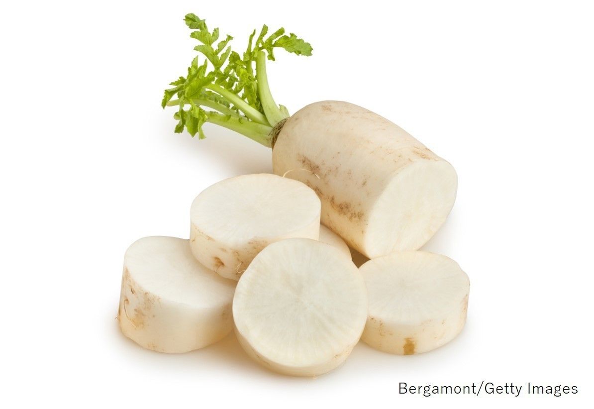 大根は葉がついているときは切り落とします。葉は根元を濡れた新聞紙で包み、根は全体を濡れた新聞紙に包み、ポリ袋に入れて野菜室で保存します。