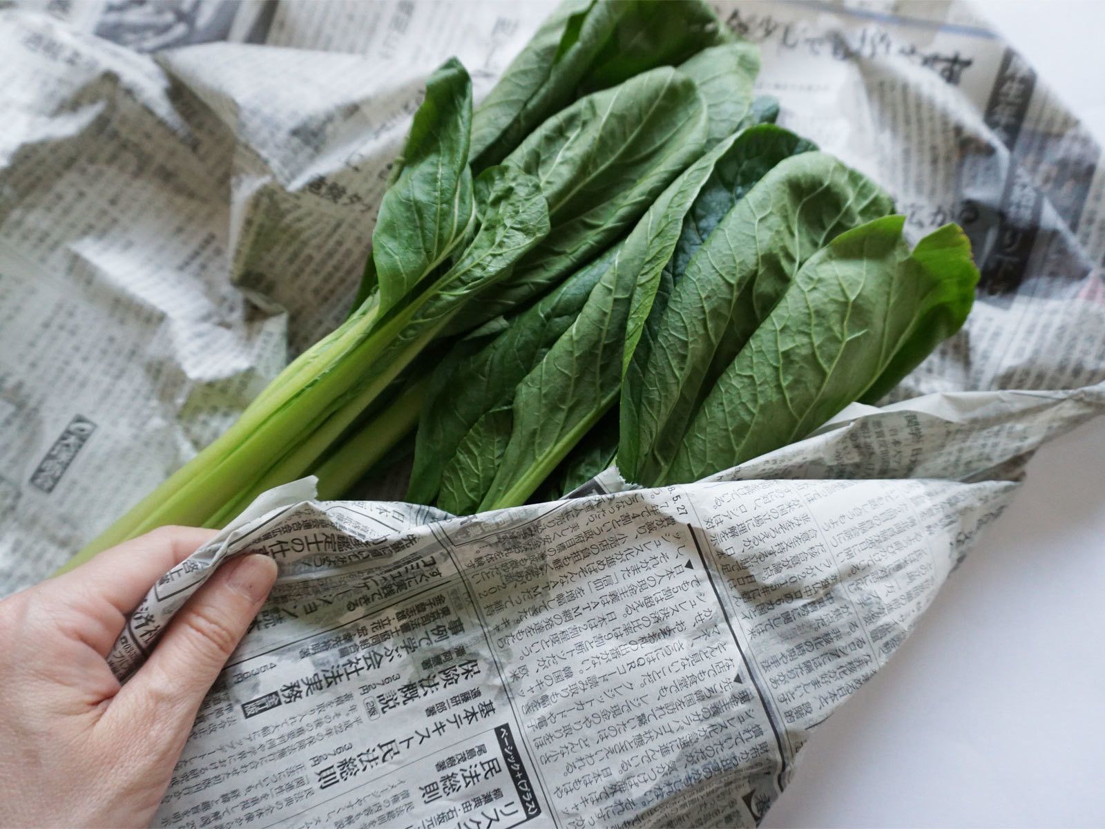 ほうれん草や小松菜は濡らした新聞紙で包み、ポリ袋に入れて、根を下にして立てて野菜室で保存します。